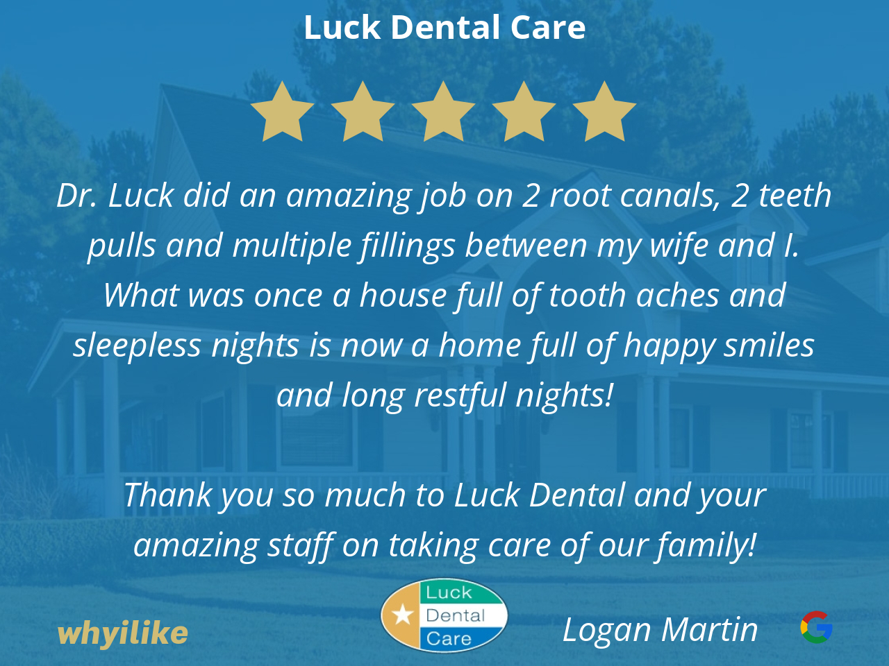 Dr. Luck did an amazing job on 2 root canals, 2 teeth pulls and multiple fillings between my wife and I. What was once a house full of tooth aches and sleepless nights is now a home full of happy smiles and long restful nights!