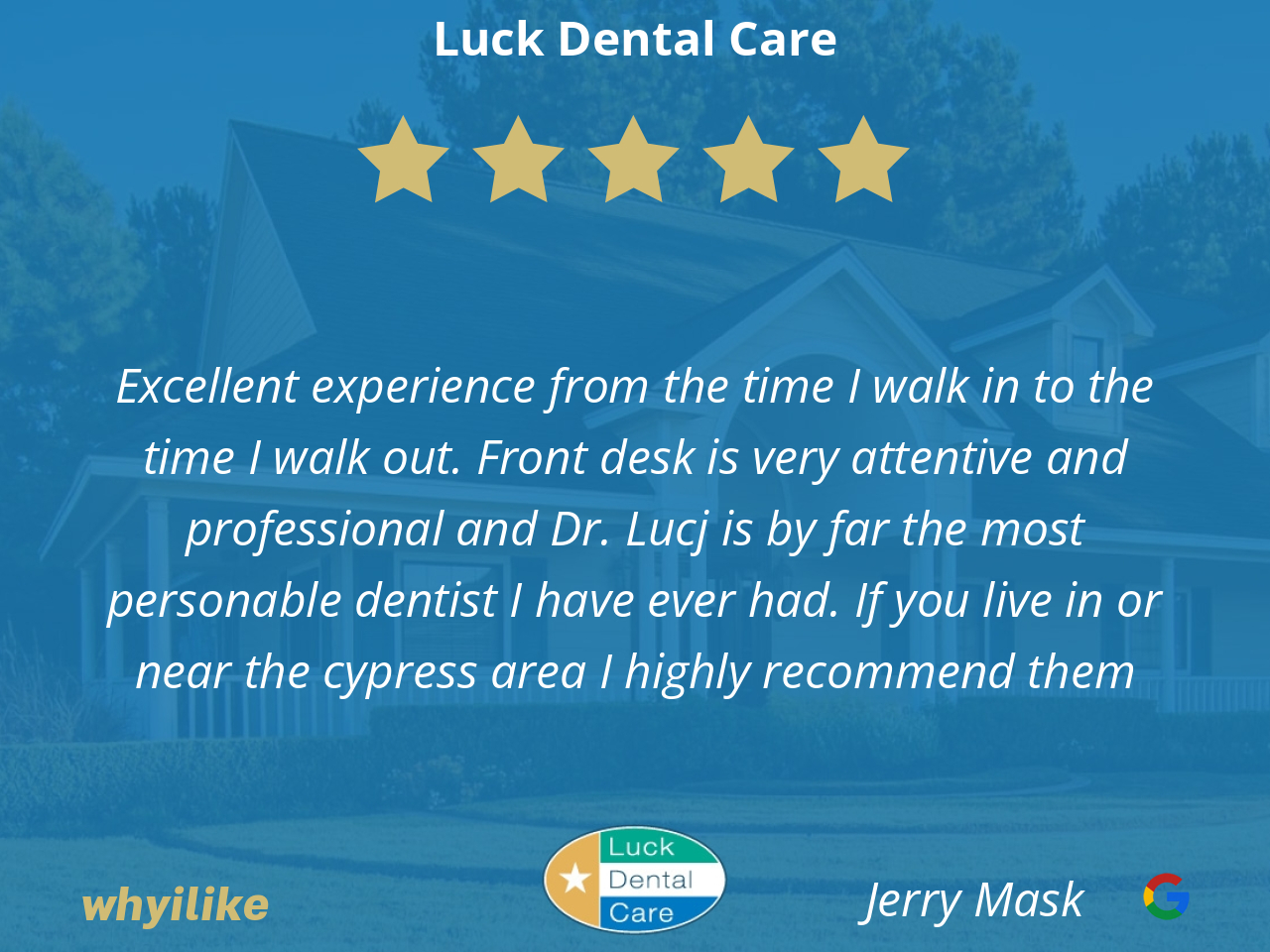 Excellent experience from the time I walk in to the time I walk out. Front desk is very attentive and professional and Dr. Lucj is by far the most personable dentist I have ever had. If you live in or near the cypress area I highly recommend them