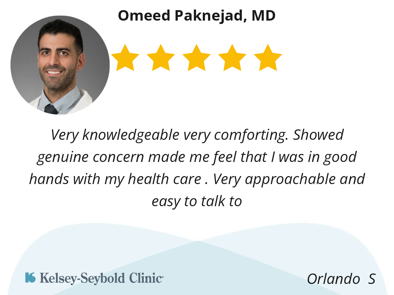 Very knowledgeable very comforting. Showed genuine concern made me feel that I was in good hands with my health care . Very approachable and easy to talk to
