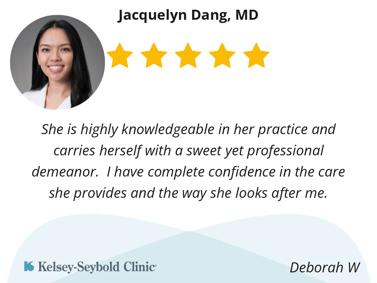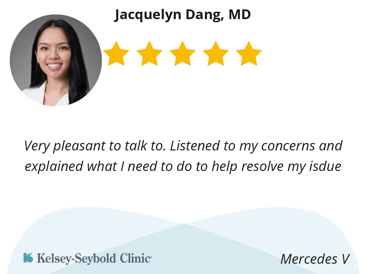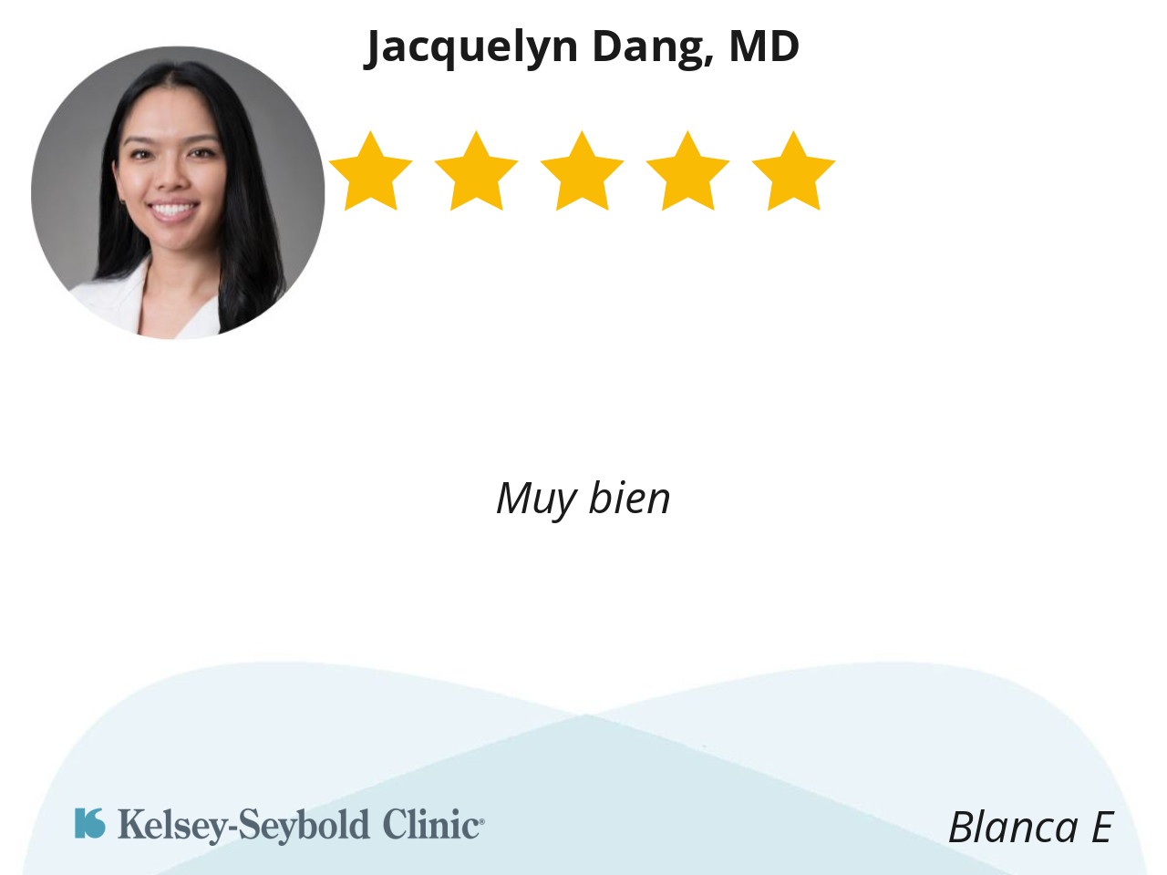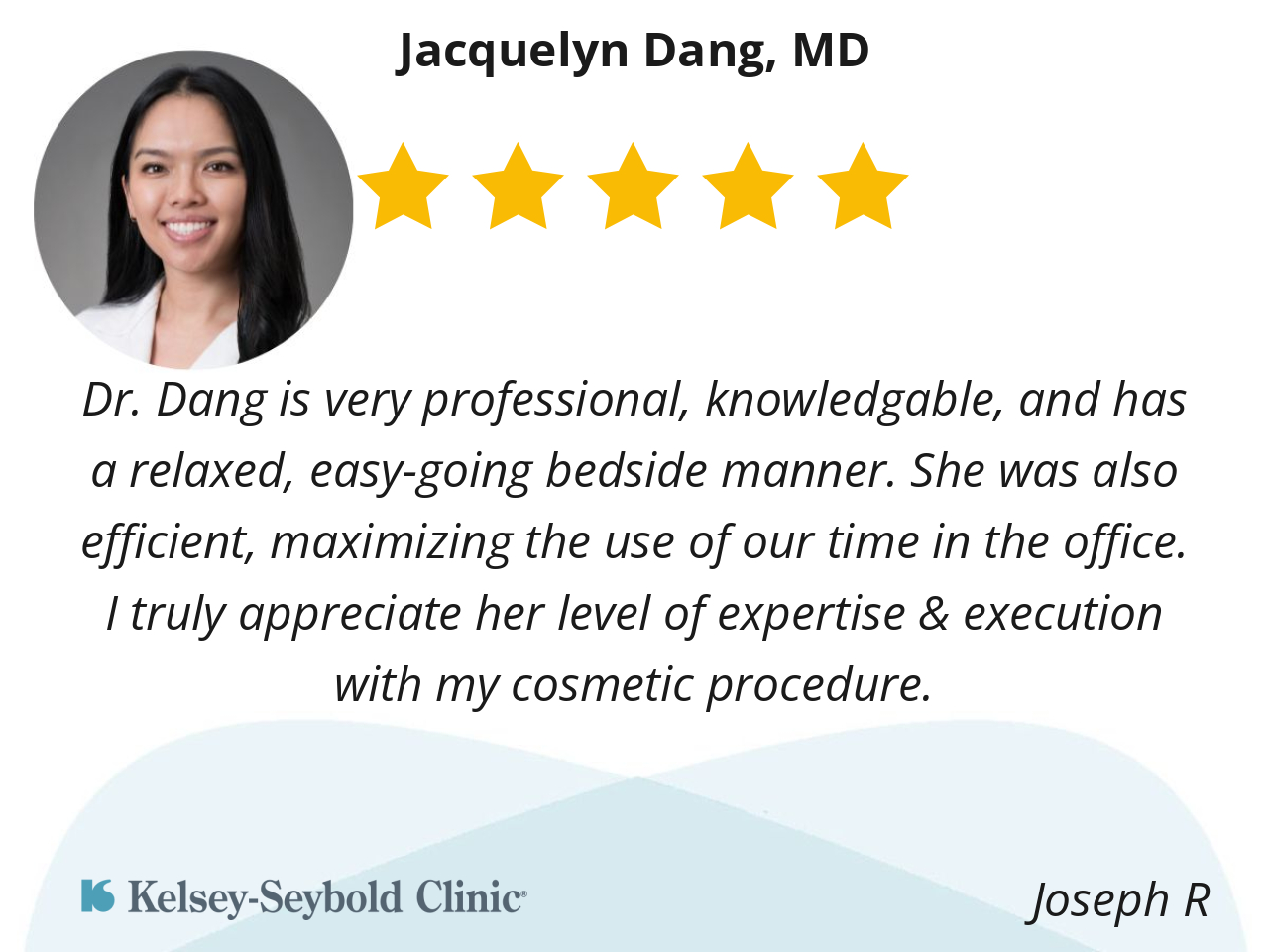 Dr. Dang is very professional, knowledgable, and has a relaxed, easy-going bedside manner. She was also efficient, maximizing the use of our time in the office. I truly appreciate her level of expertise & execution with my cosmetic procedure.