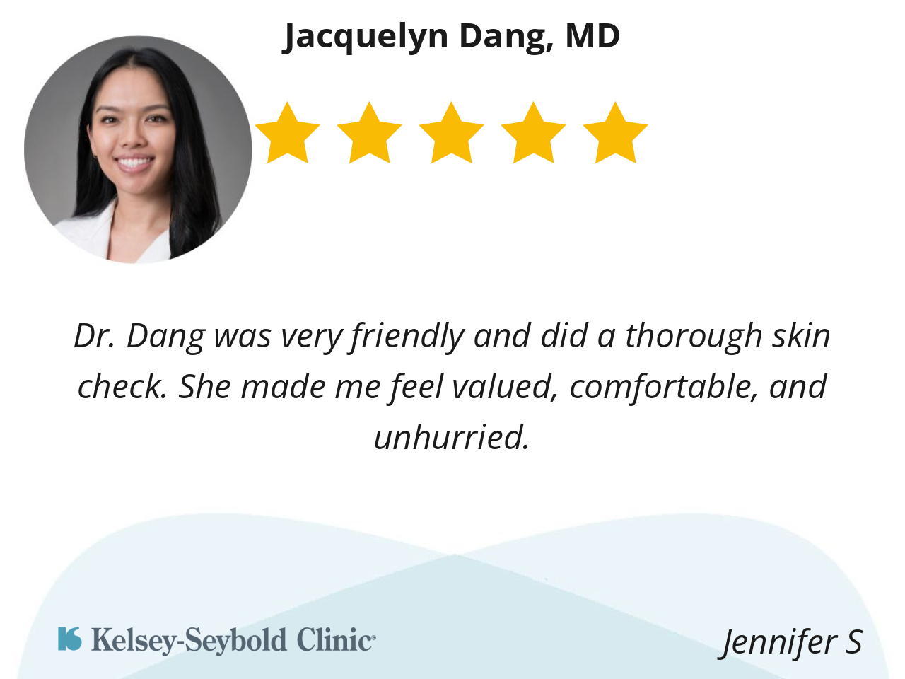Dr. Dang was very friendly and did a thorough skin check. She made me feel valued, comfortable, and unhurried.