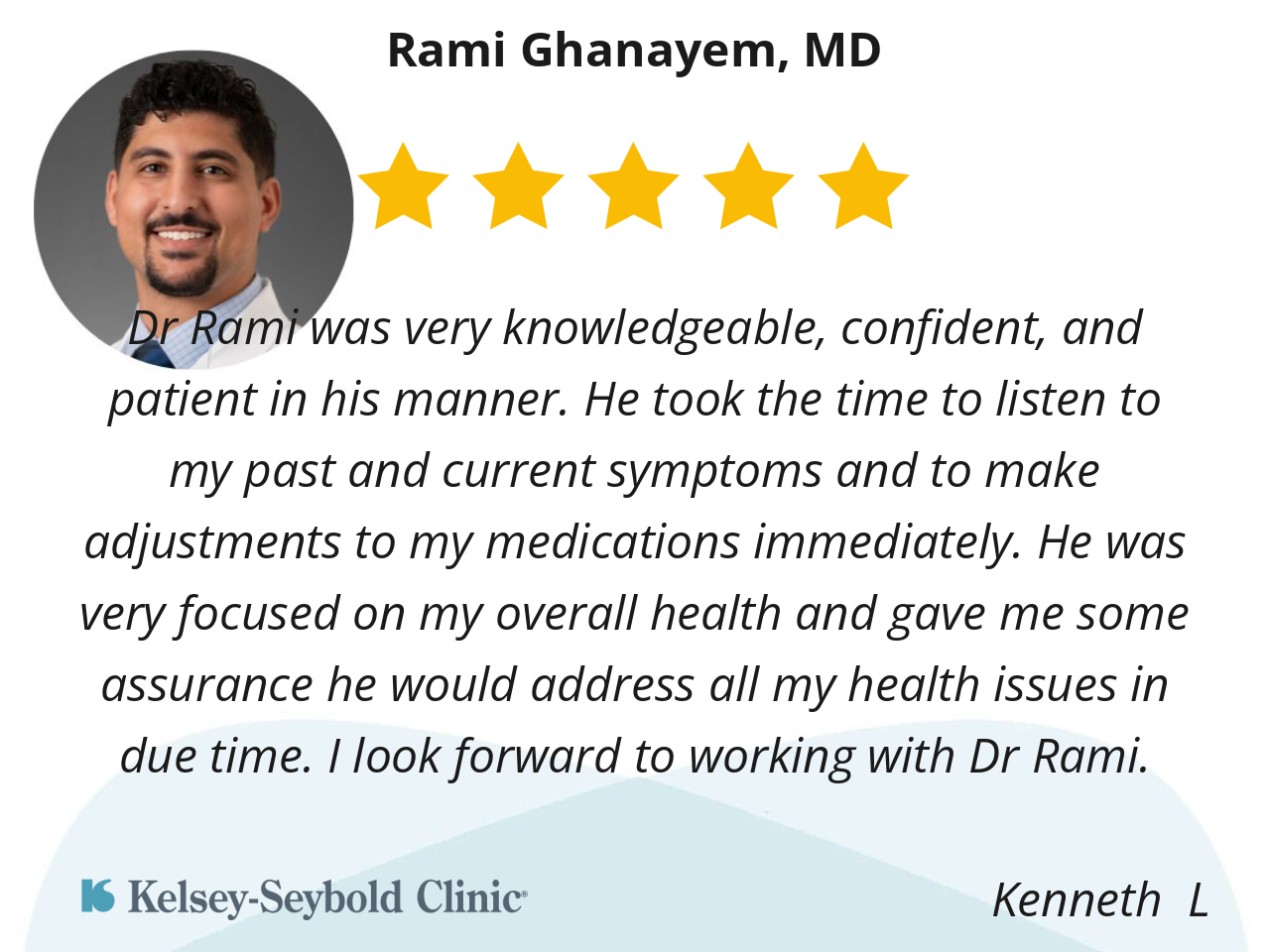 Dr Rami was very knowledgeable, confident, and patient in his manner. He took the time to listen to my past and current symptoms and to make adjustments to my medications immediately. He was very focused on my overall health and gave me some assurance he would address all my health issues in due time. I look forward to working with Dr Rami.