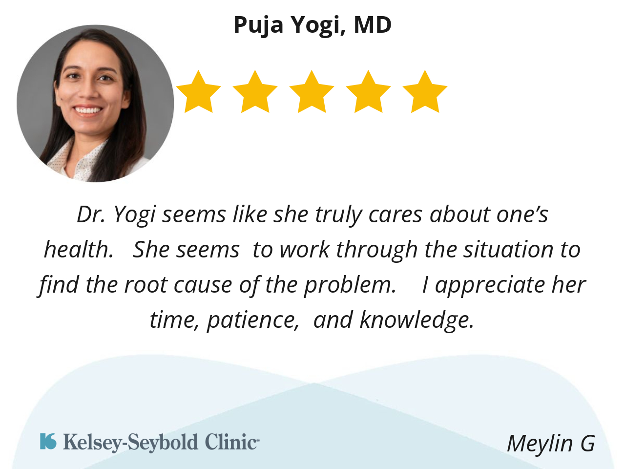 Dr. Yogi seems like she truly cares about one’s health. She seems to work through the situation to find the root cause of the problem. I appreciate her time, patience, and knowledge.