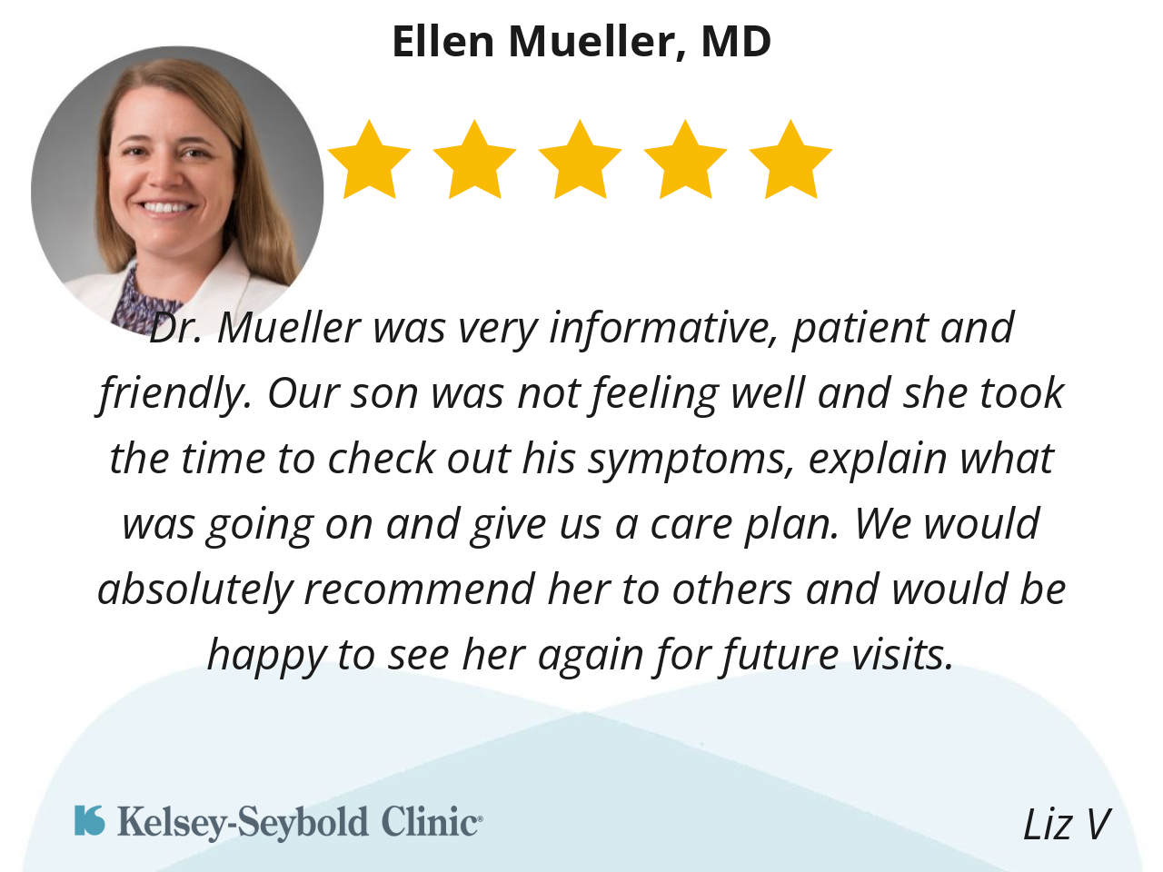Dr. Mueller was very informative, patient and friendly. Our son was not feeling well and she took the time to check out his symptoms, explain what was going on and give us a care plan. We would absolutely recommend her to others and would be happy to see her again for future visits.