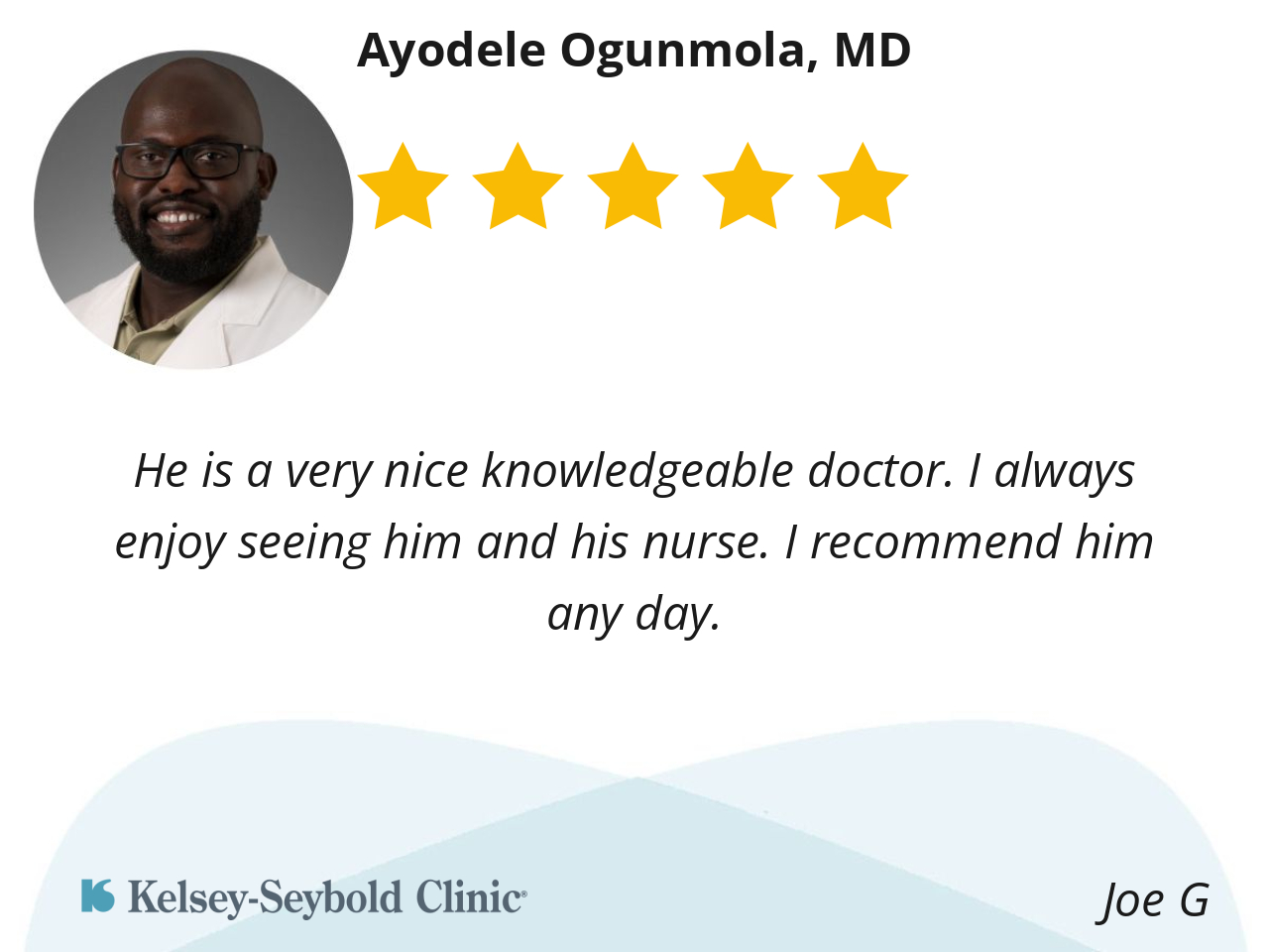Dr. Ogunmola listens to my concerns and is very professional in his approach to patient care. It is very important to me to have a Dr. that treats me as an individual and not just the “next” patient