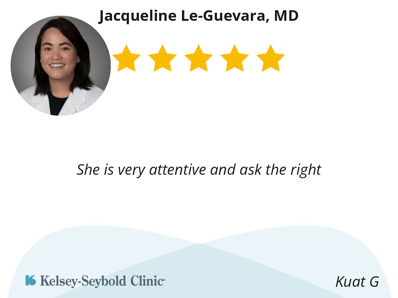 I like doctor Jacqueline because of her high competency. She is vey kind, understandable and most of all give me excellent guidance in health prevention