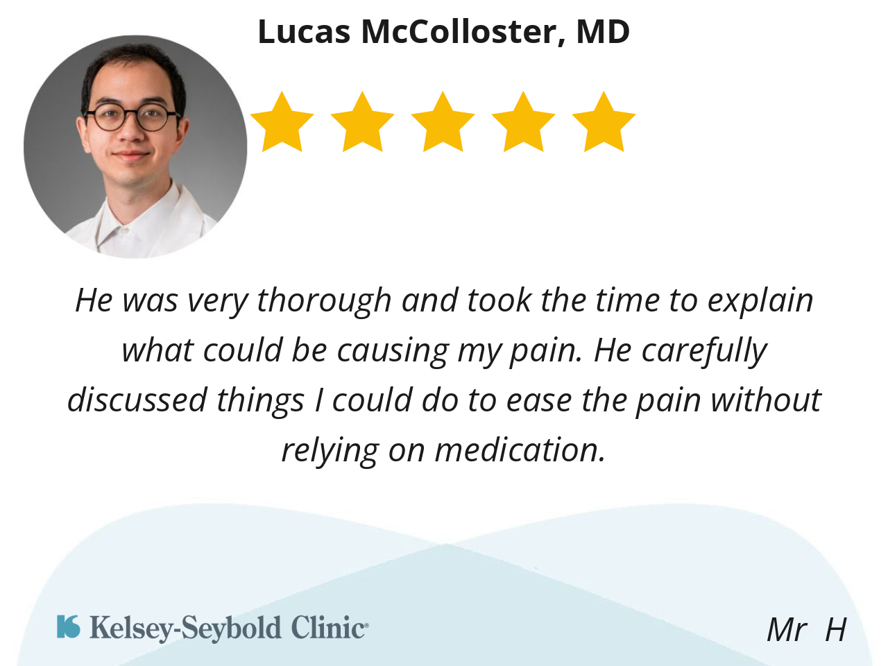 He was very thorough and took the time to explain what could be causing my pain. He carefully discussed things I could do to ease the pain without relying on medication.