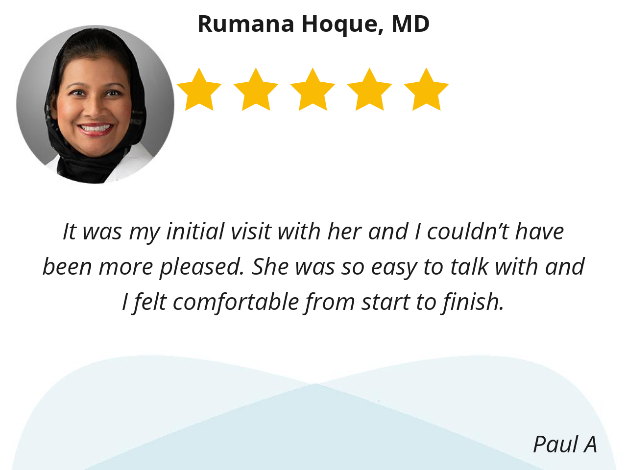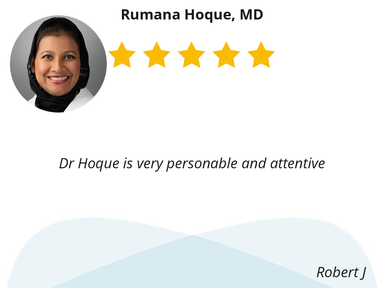 Dr. Rumana Hoque is exceptionally kind and professional. I truly enjoy my visits with her, and she always provides the care and support I need.