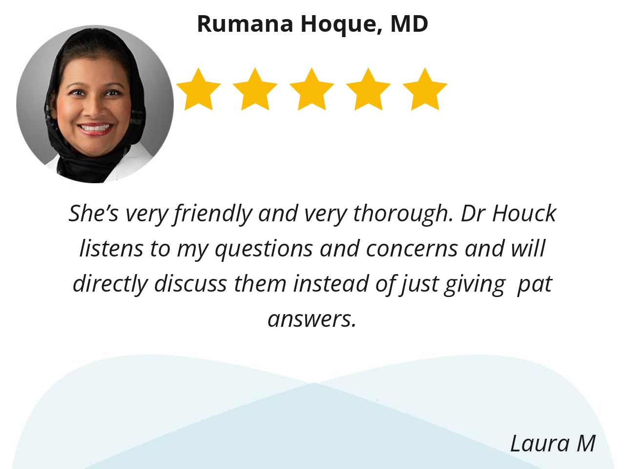 Dr. Hoque is exceptionally kind and professional. I truly enjoy my visits with her, and she always provides the care and support I need.