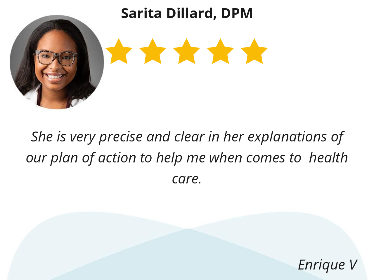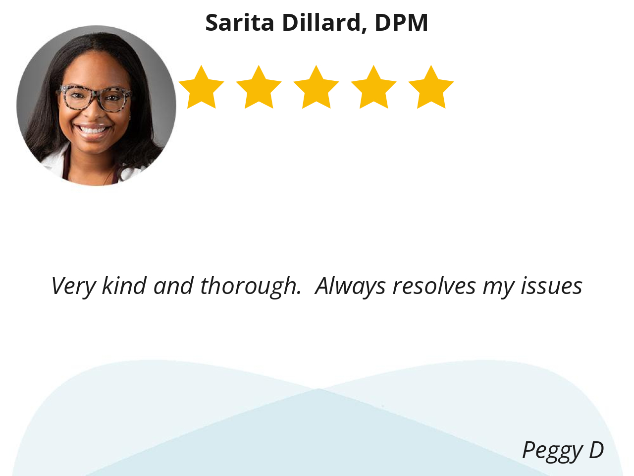 I ABSOLUTELY love Dr. Dillard she always knows what is wrong and is right every time. Her personality is wonderful. I will never see anyone but her for podiatry.