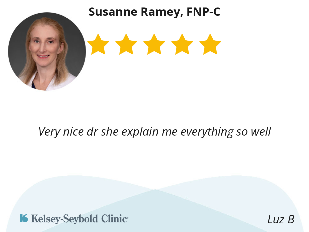 Susanne Ramey..in my opinion..is a warm and pleasant physician...im most definitely would like to have ser as my medical provider..kArTeTpAuL...