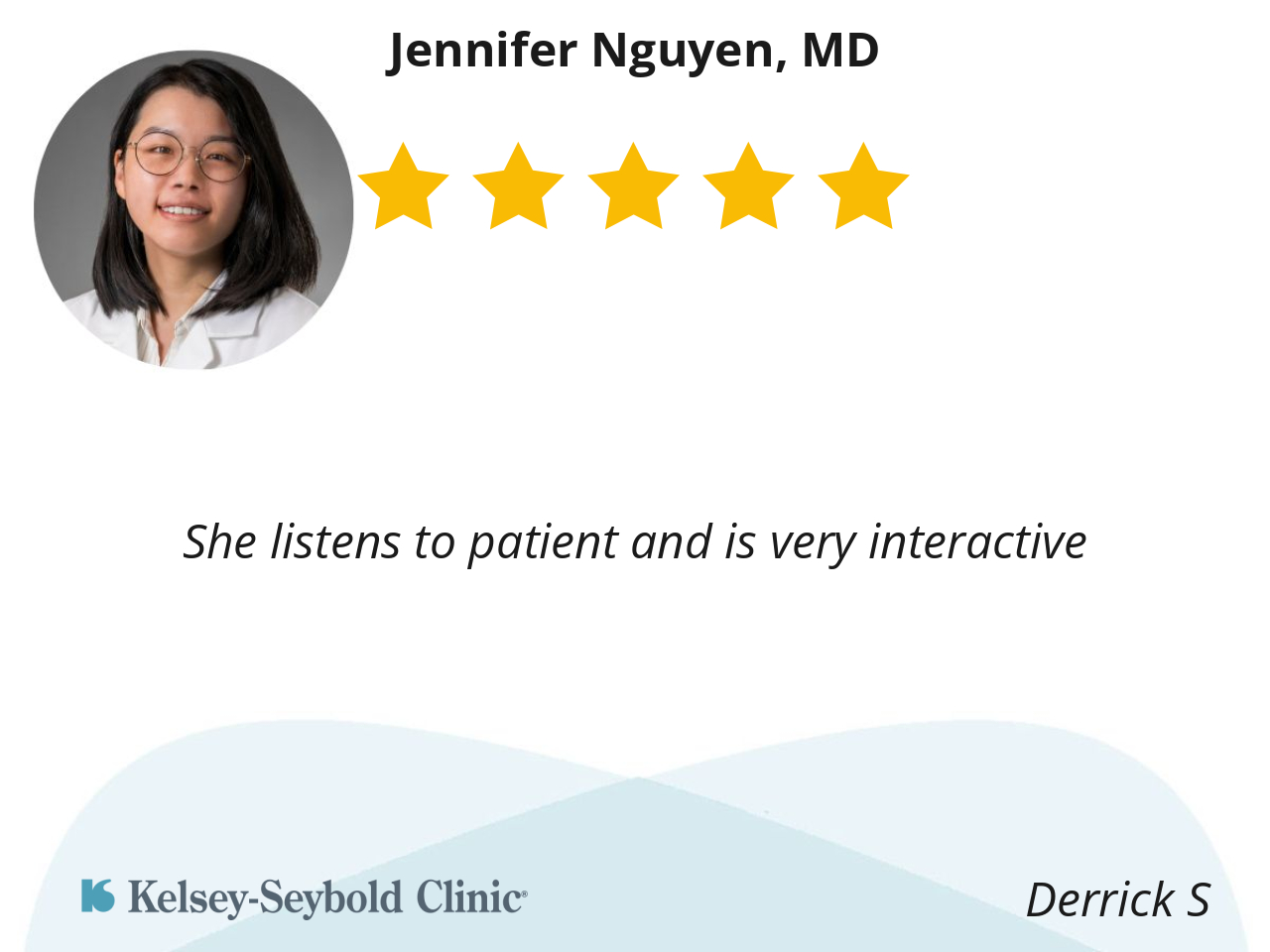 Dr. Nguyen is great! She takes her time to answer questions, and has a caring attitude.