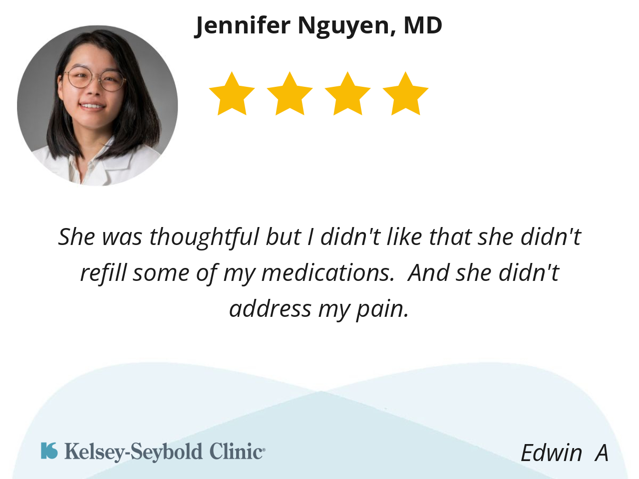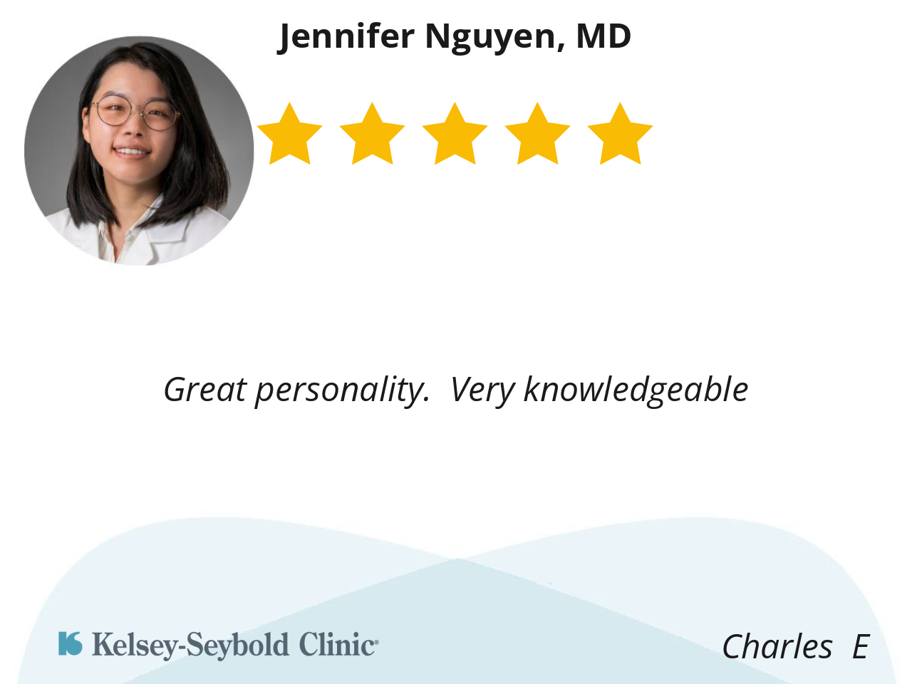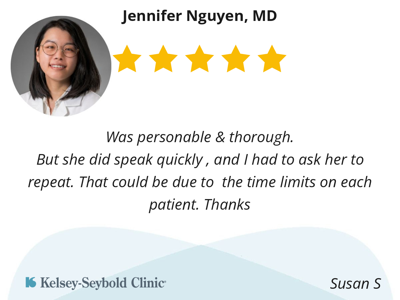 Dr. Nguyen is thorough and makes sure I understand what she tells me. I feel comfortable with her and never feel like I'm being hurried through so she can get to her next patient.