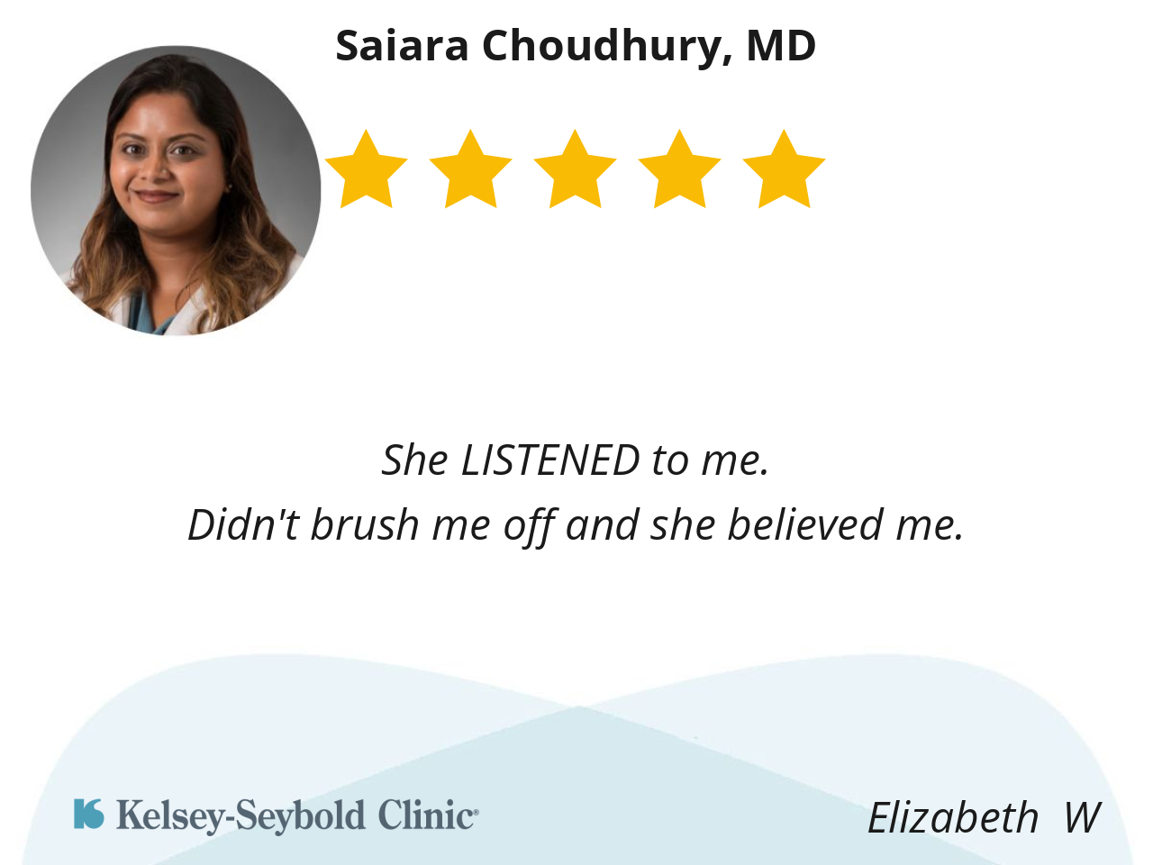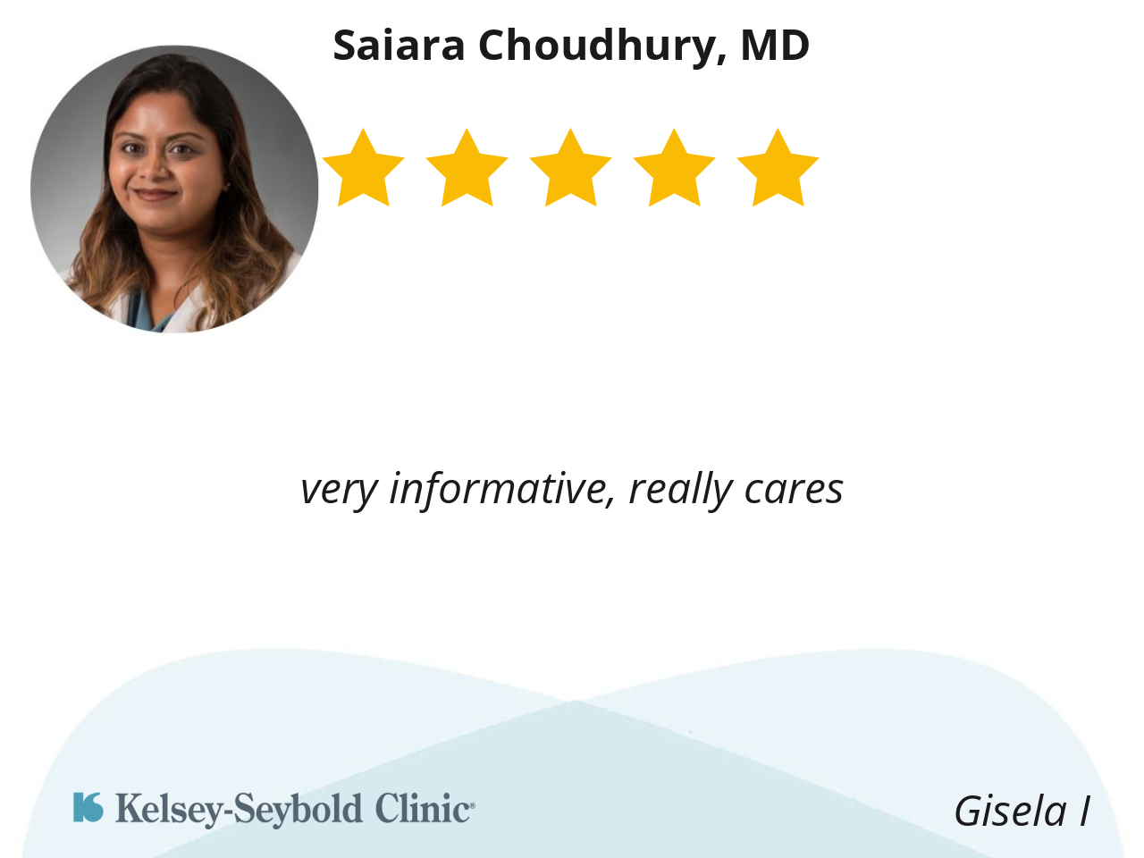 She listens to her patients and works with them very carefully. Excellent bedside manner! Understands and makes sure that you understand what is going on.
