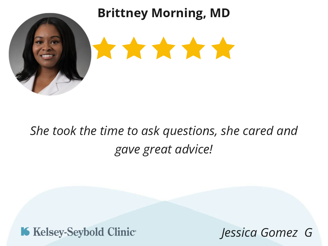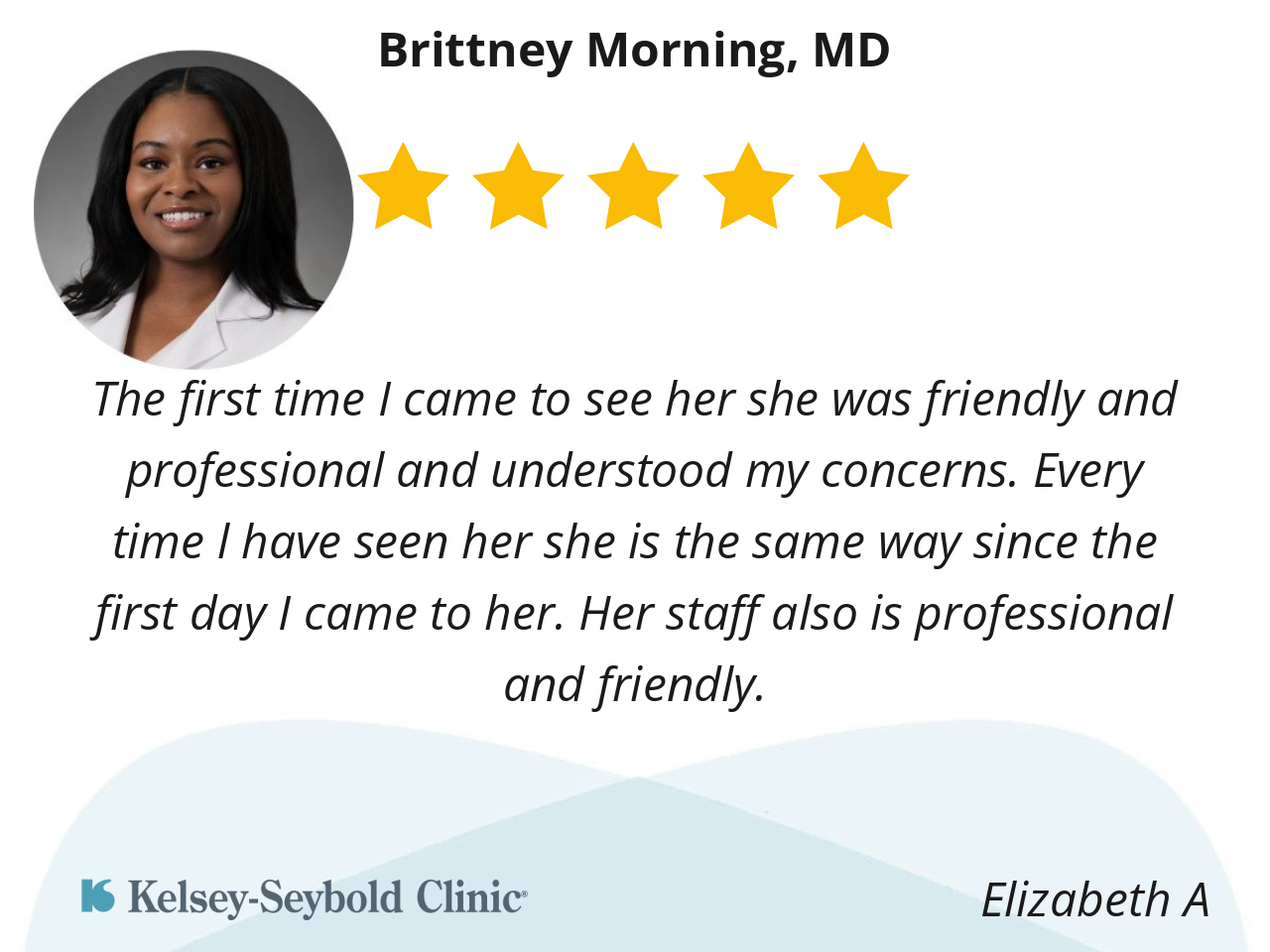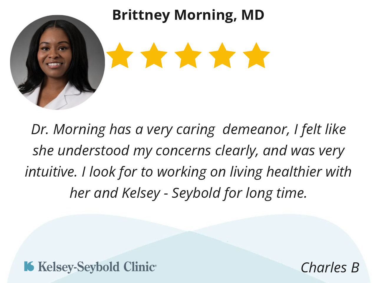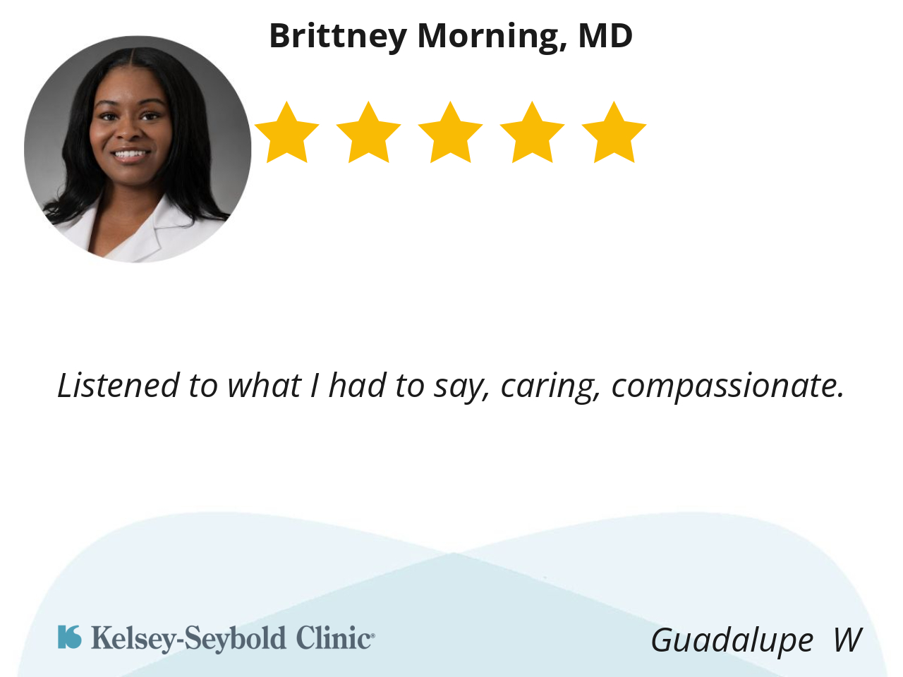 Dr. Morning has a very caring demeanor, I felt like she understood my concerns clearly, and was very intuitive. I look for to working on living healthier with her and Kelsey - Seybold for long time.