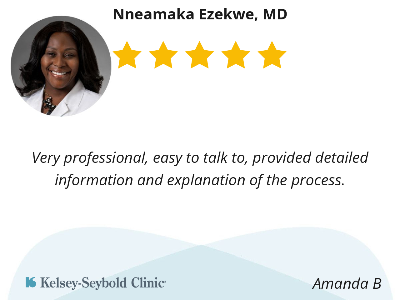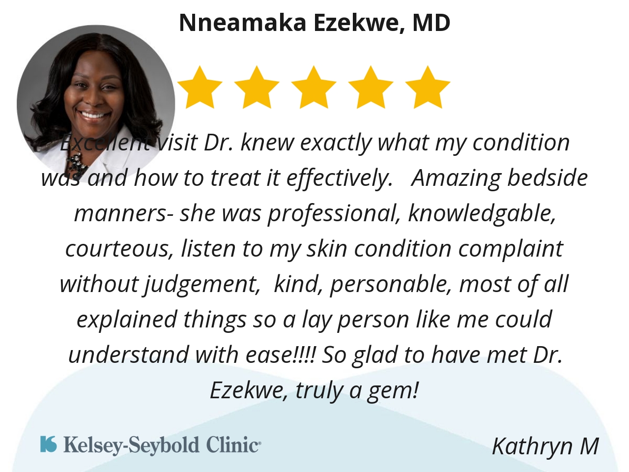 Dr. Ezekwe had a good bed side manner which is vitally important to me. She listened to my concerns without rushing me and she did her best to answer all questions. I was apprehensive about finding a dermatologist at Kelsey that is familiar with African American skin and hair, but I think Dr. Ezekwe meets the requirements per our session.