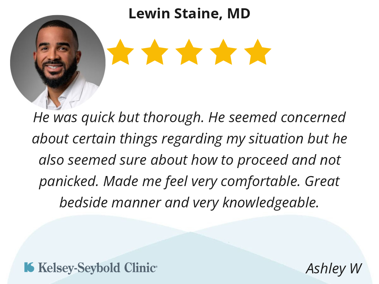 I was worried of seeing a new doctor ; but I am happy I chose Dr . Staine. He communication during exam was flawless. Thanks Kelsey for your selection .