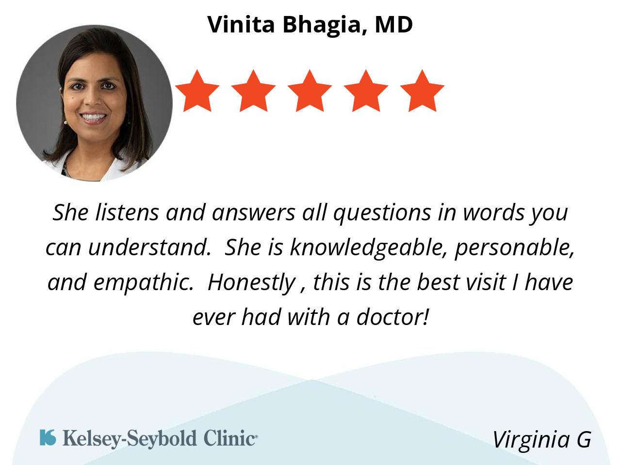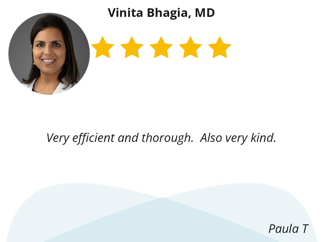 Dr. Bhagia is so knowledgeable and answers all my questions. She has a wonderful demeanor and bedside manner.