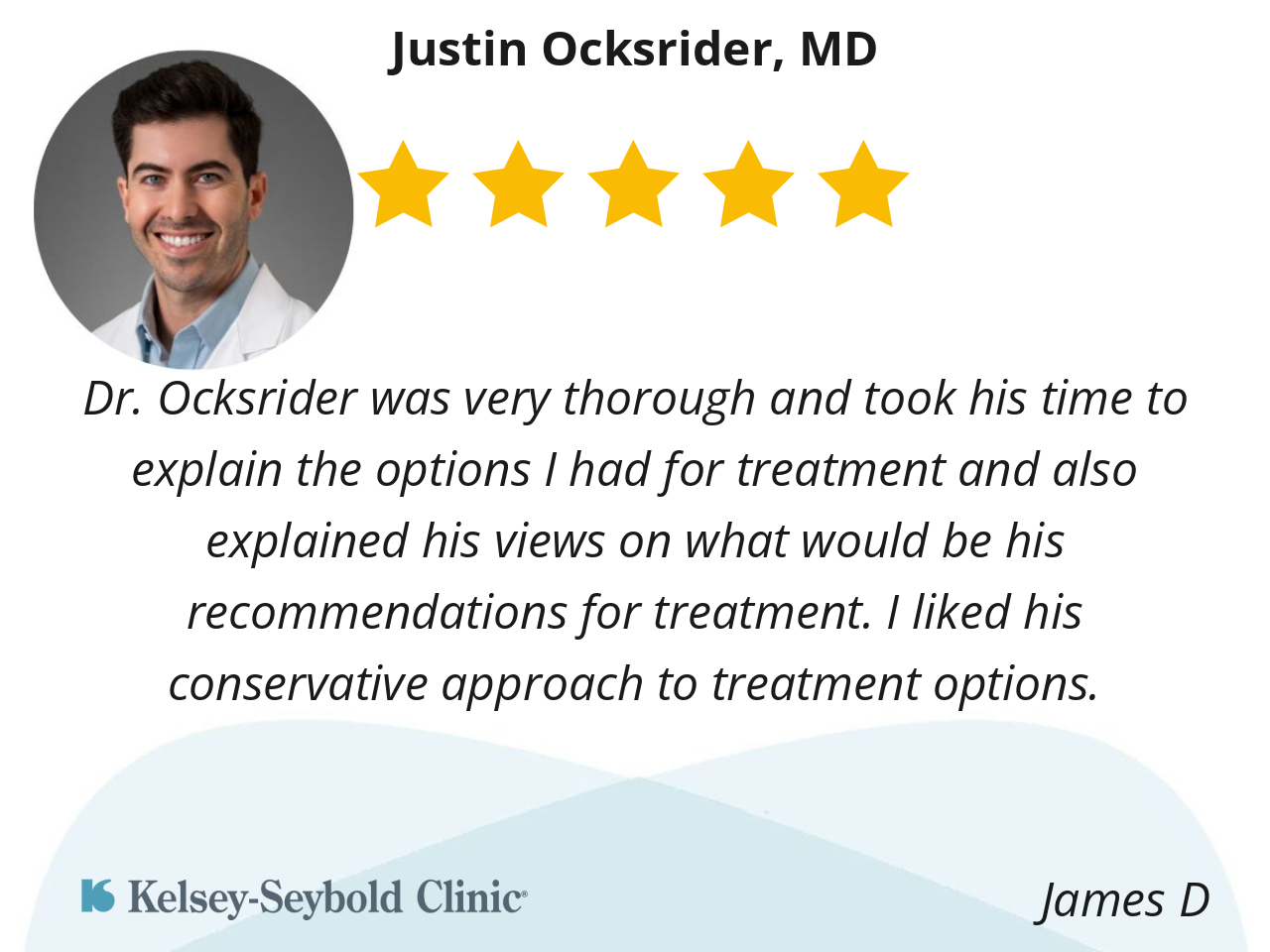 Dr. Ocksrider was very thorough and took his time to explain the options I had for treatment and also explained his views on what would be his recommendations for treatment. I liked his conservative approach to treatment options.