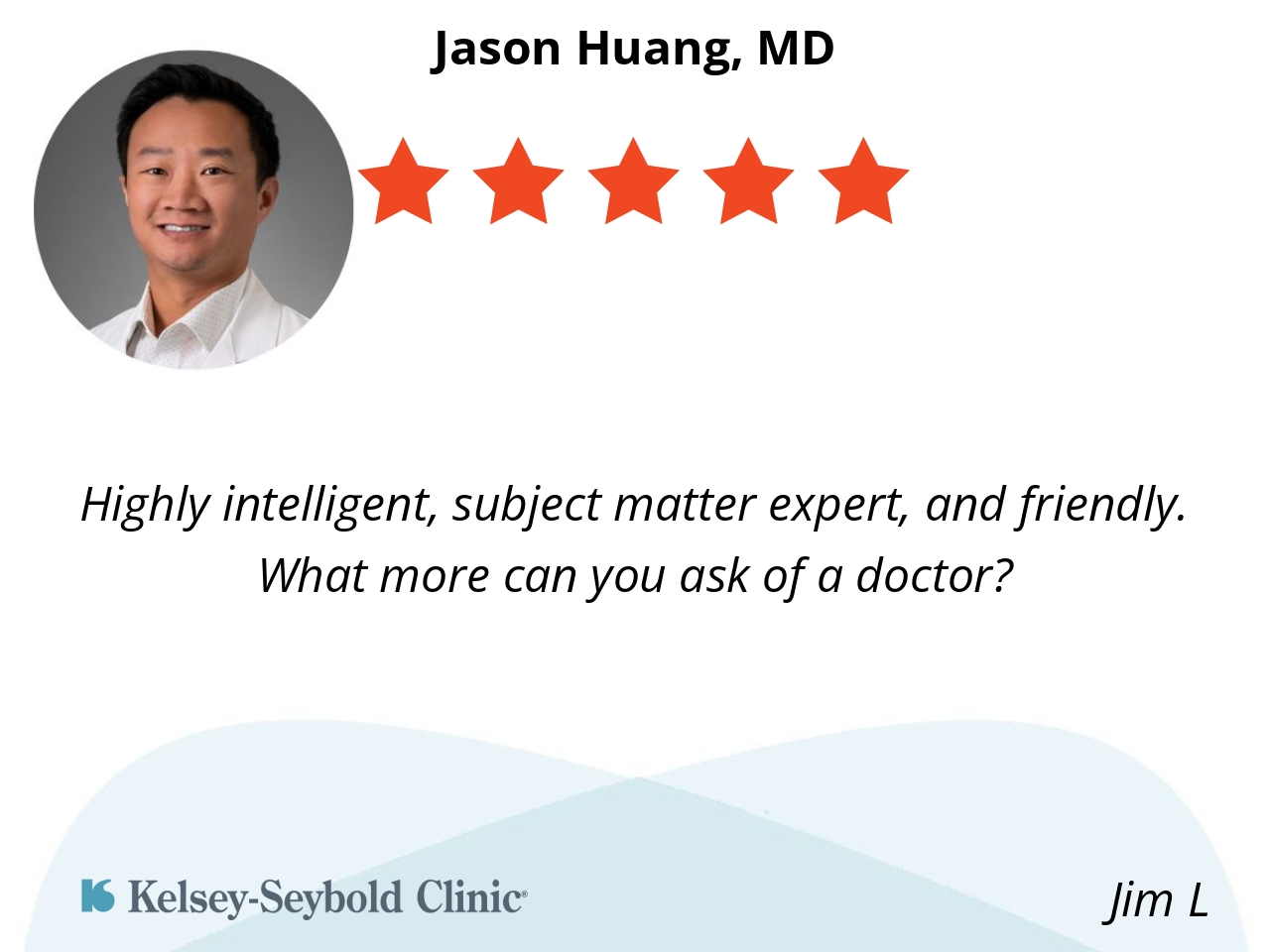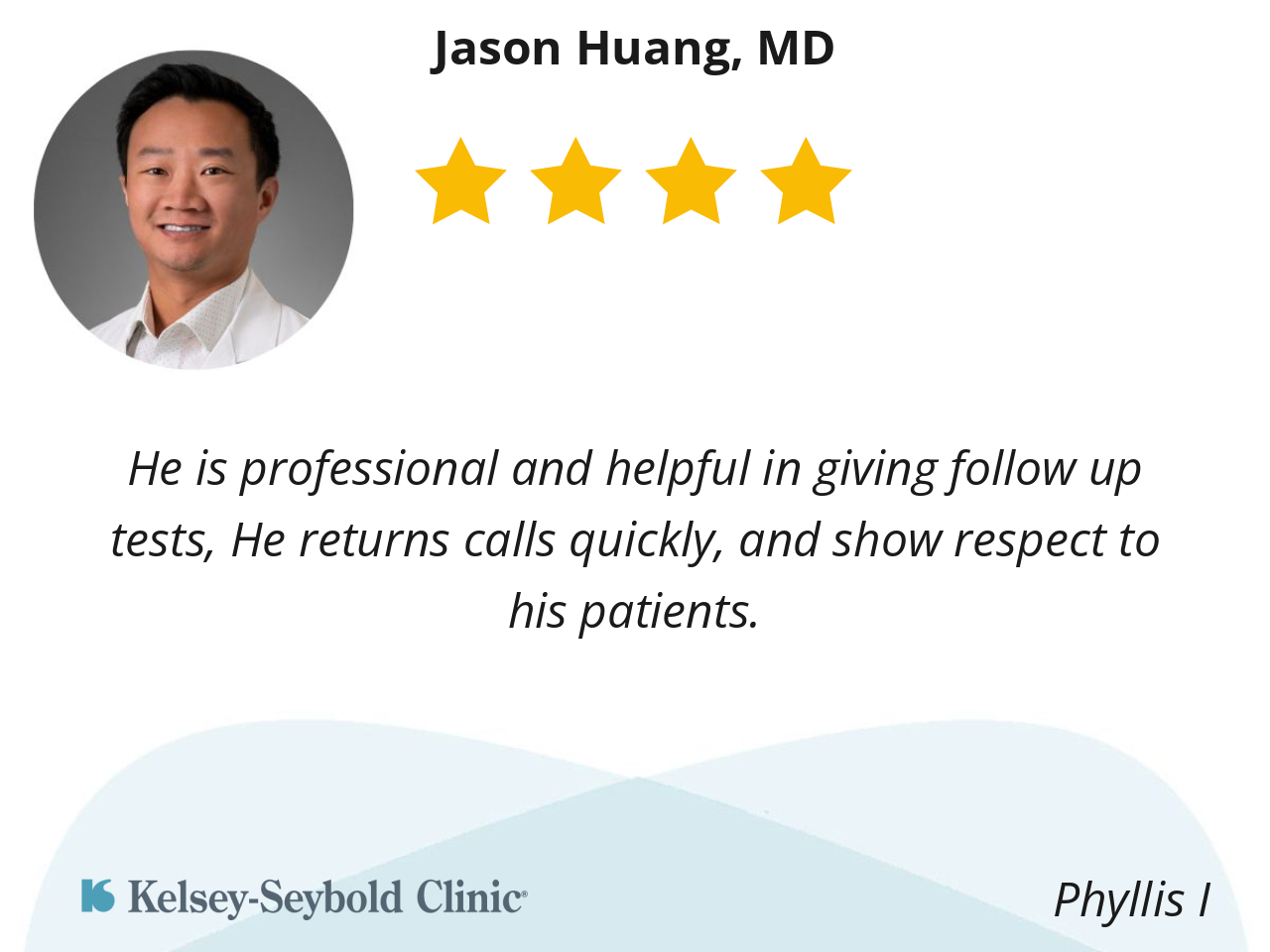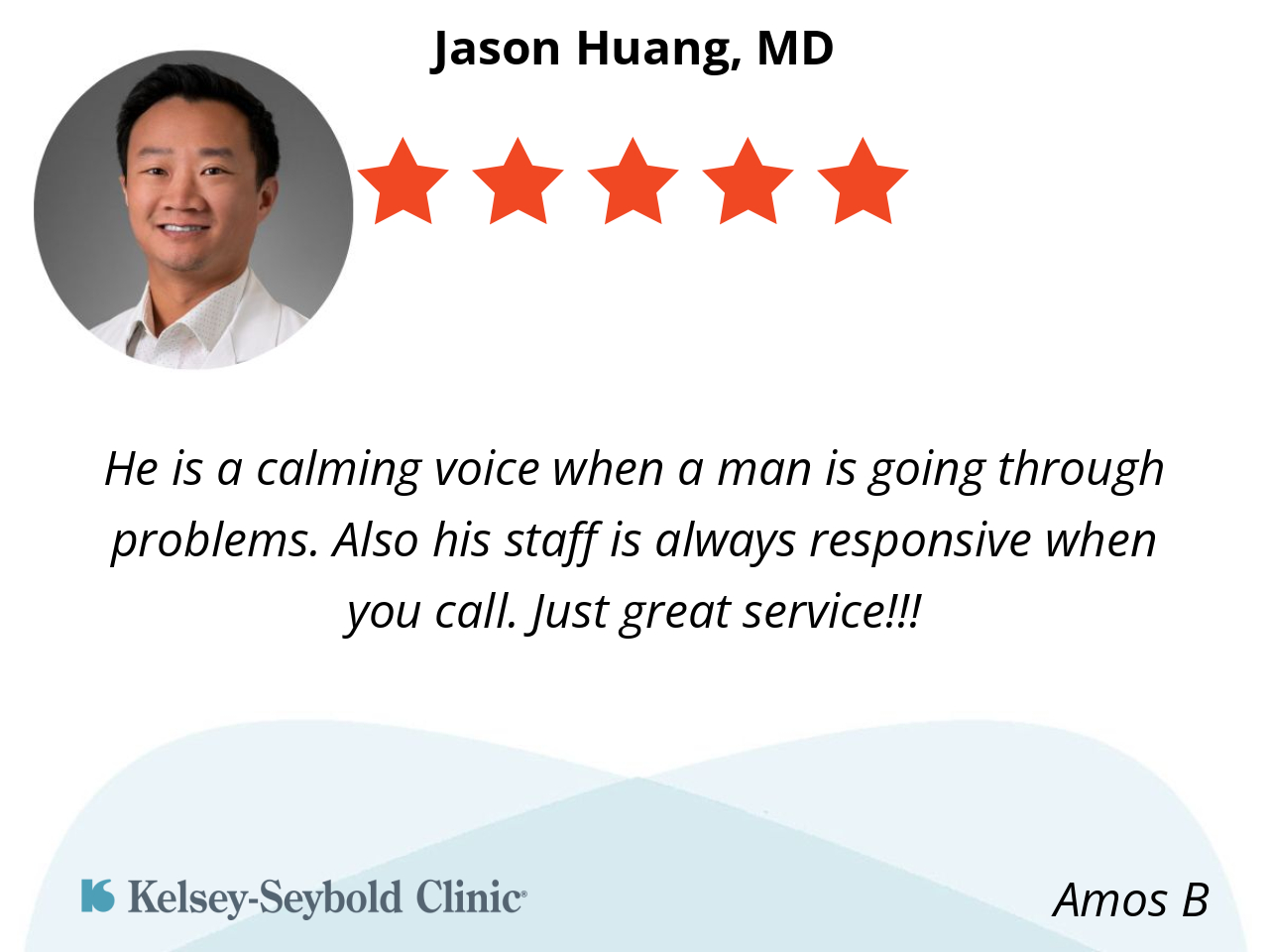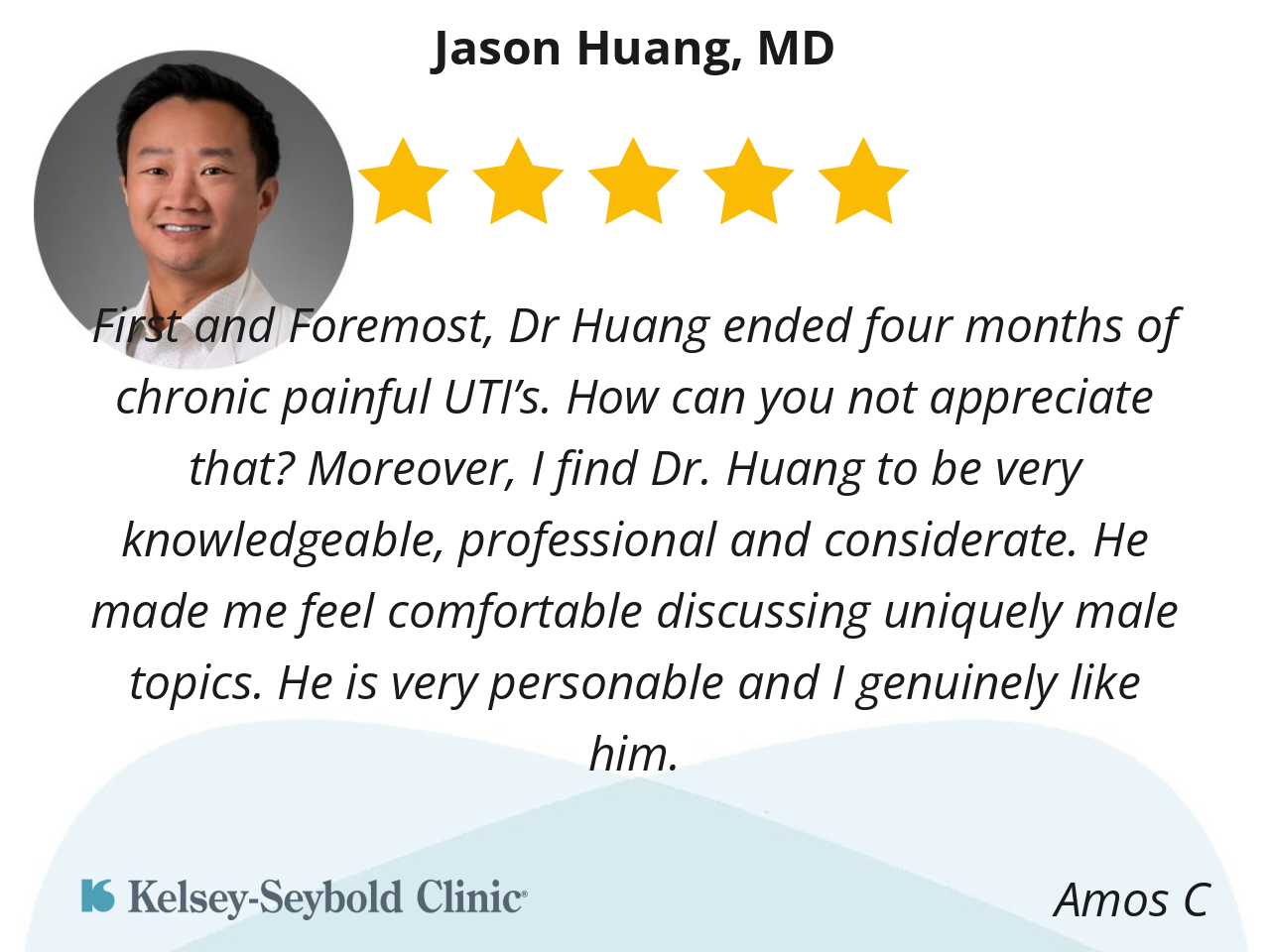 First and Foremost, Dr Huang ended four months of chronic painful UTI’s. How can you not appreciate that? Moreover, I find Dr. Huang to be very knowledgeable, professional and considerate. He made me feel comfortable discussing uniquely male topics. He is very personable and I genuinely like him.