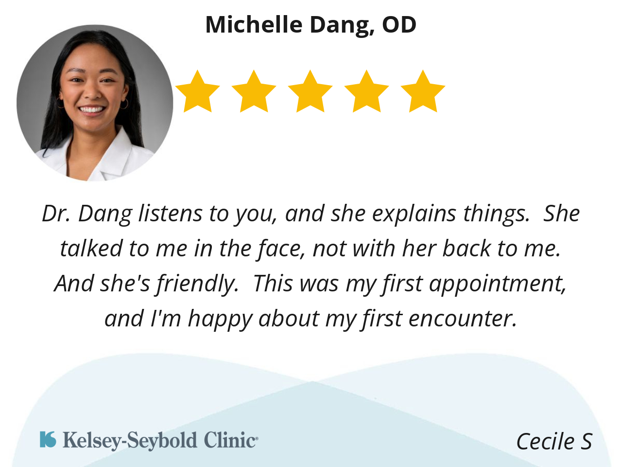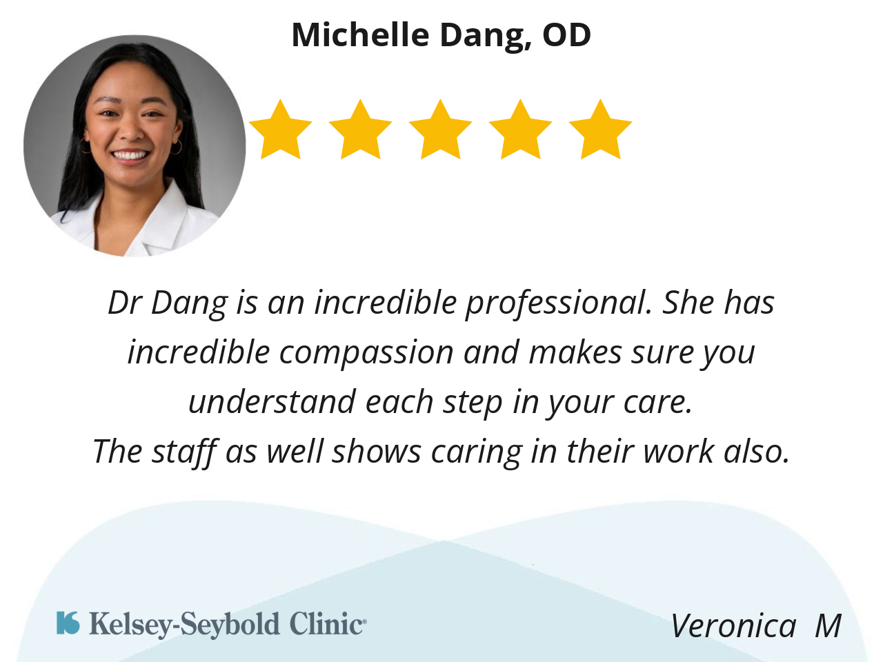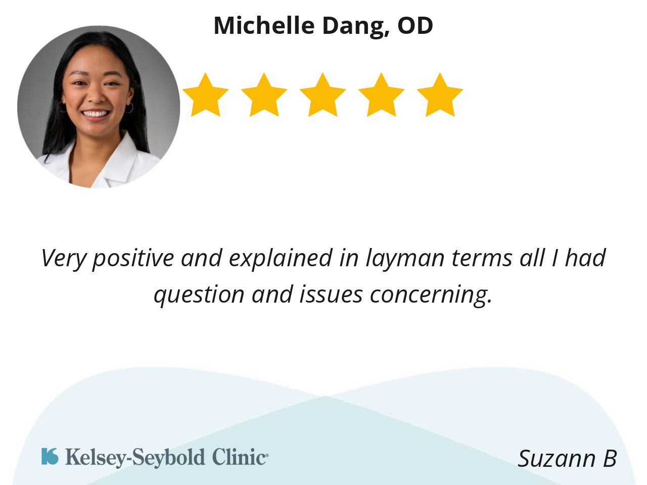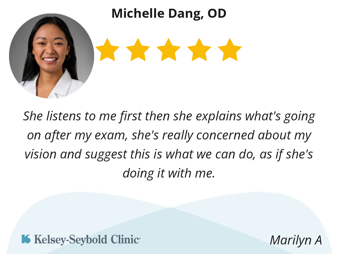 My experience with Michelle Dang, OD was very positive. She has a friendly, professional manner. I thought her eye exam was thorough and efficient.