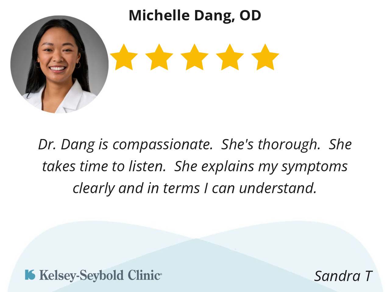 Dr. Michelle Dang is the most friendly, professional and compassionate doctor I have ever met. Her communication style is very clear and she answered all of my questions with obvious subject matter expertise.