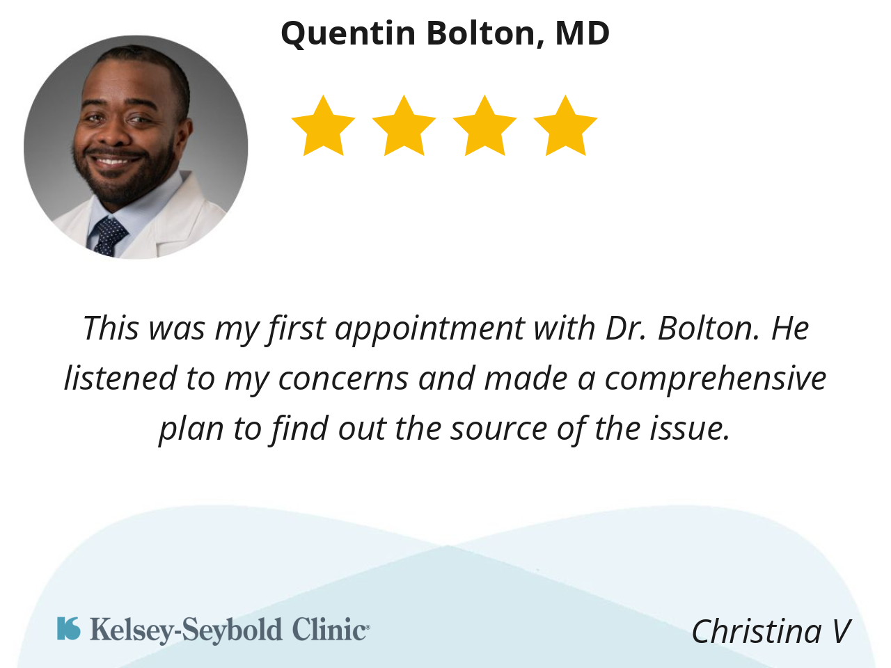 Dr Bolton, was very detailed, he explained things very well. I felt welcomed, it’s good when your doctor actually spends time explaining things before they work with you. I highly recommend him!