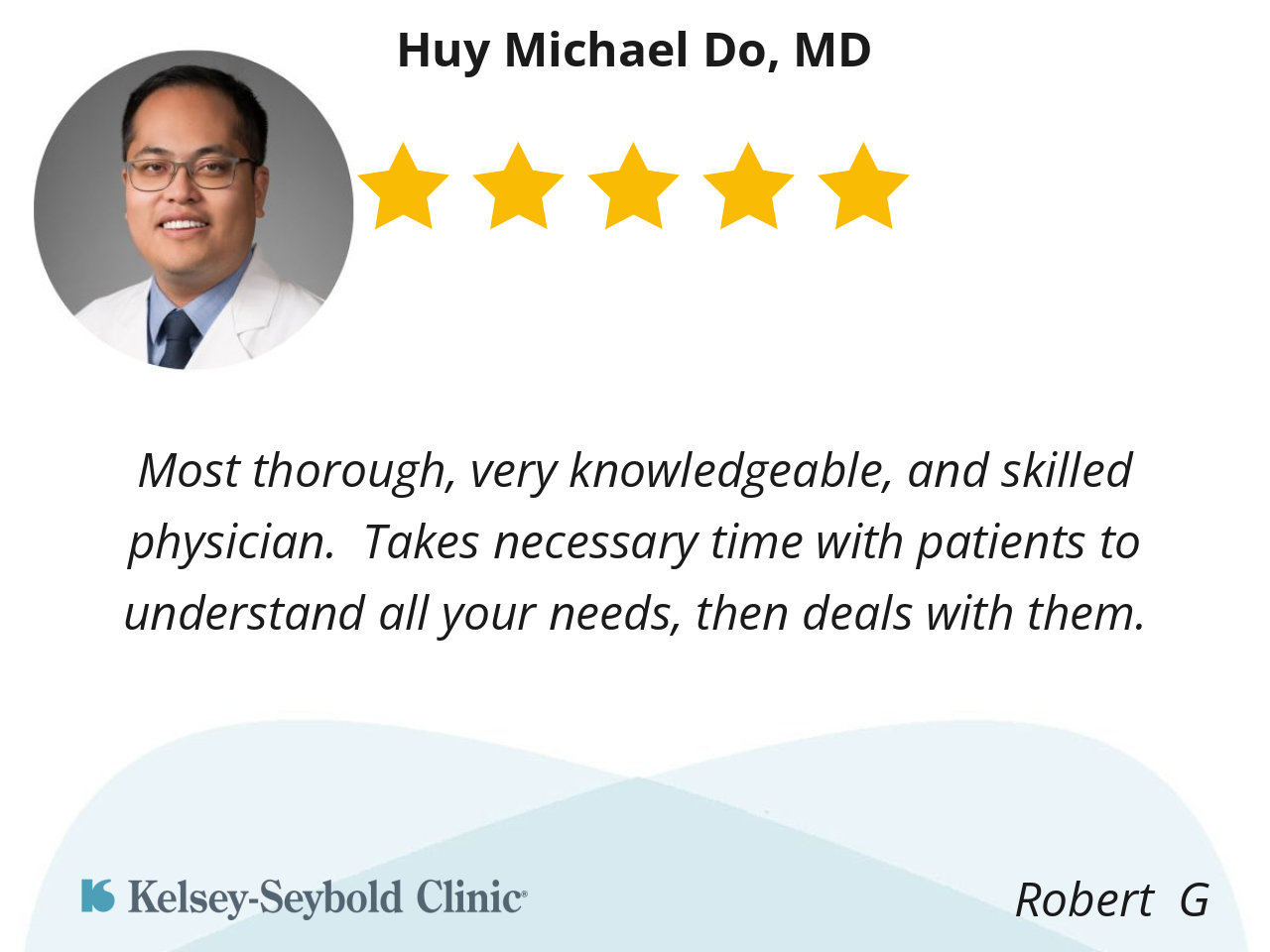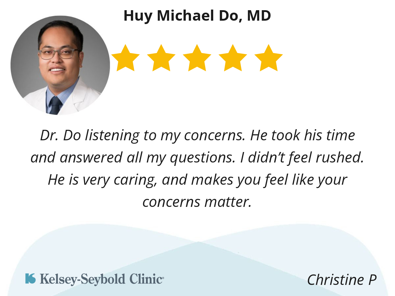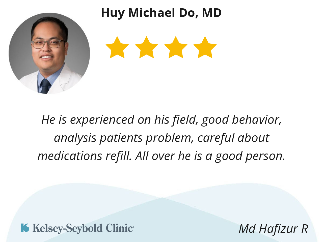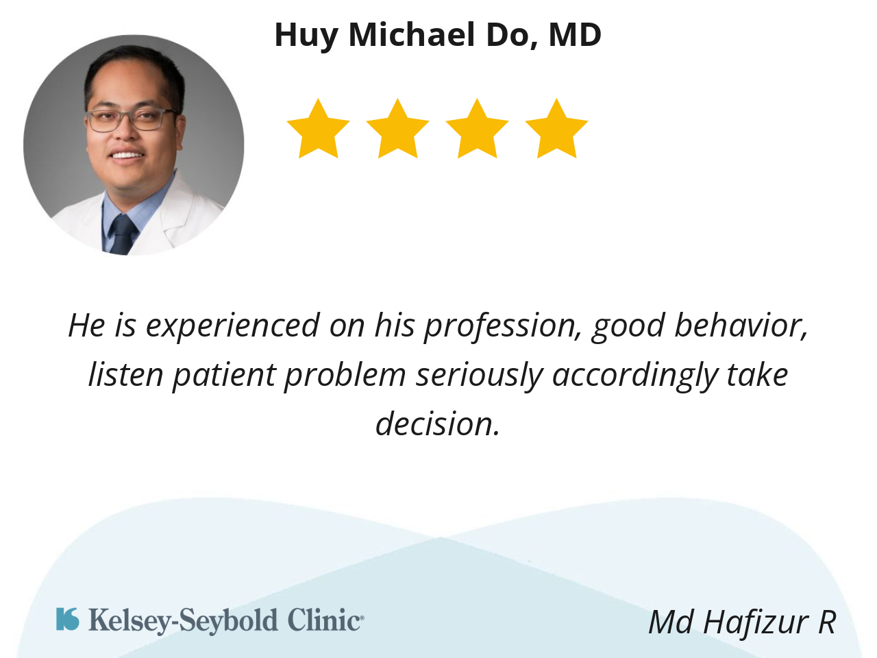 Dr. Do listening to my concerns. He took his time and answered all my questions. I didn’t feel rushed. He is very caring, and makes you feel like your concerns matter.