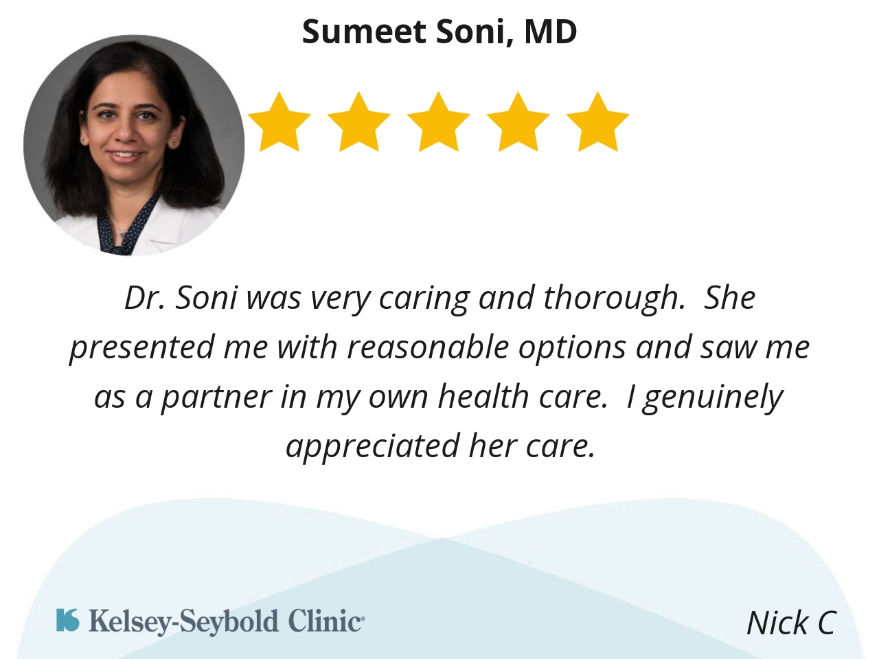 Dr. Soni was very caring and thorough. She presented me with reasonable options and saw me as a partner in my own health care. I genuinely appreciated her care.