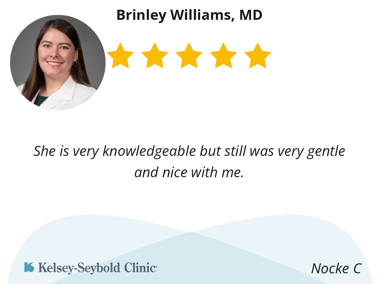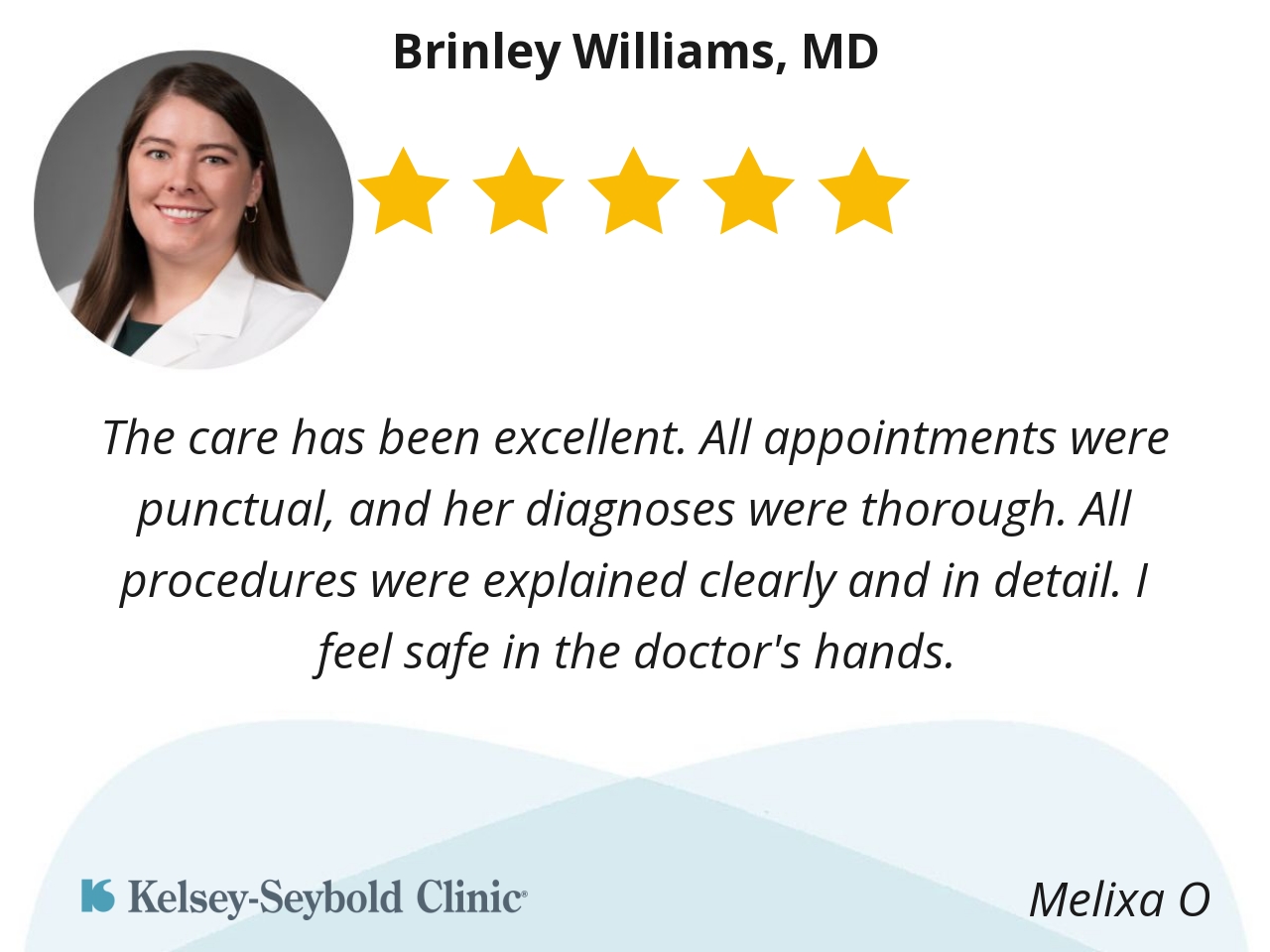 She introduced herself, looked at me when speaking, listened to my concerns and addressed them appropriately. Plus the receptionist, the medical assistant and Dr. Williams were all very professional and kind!