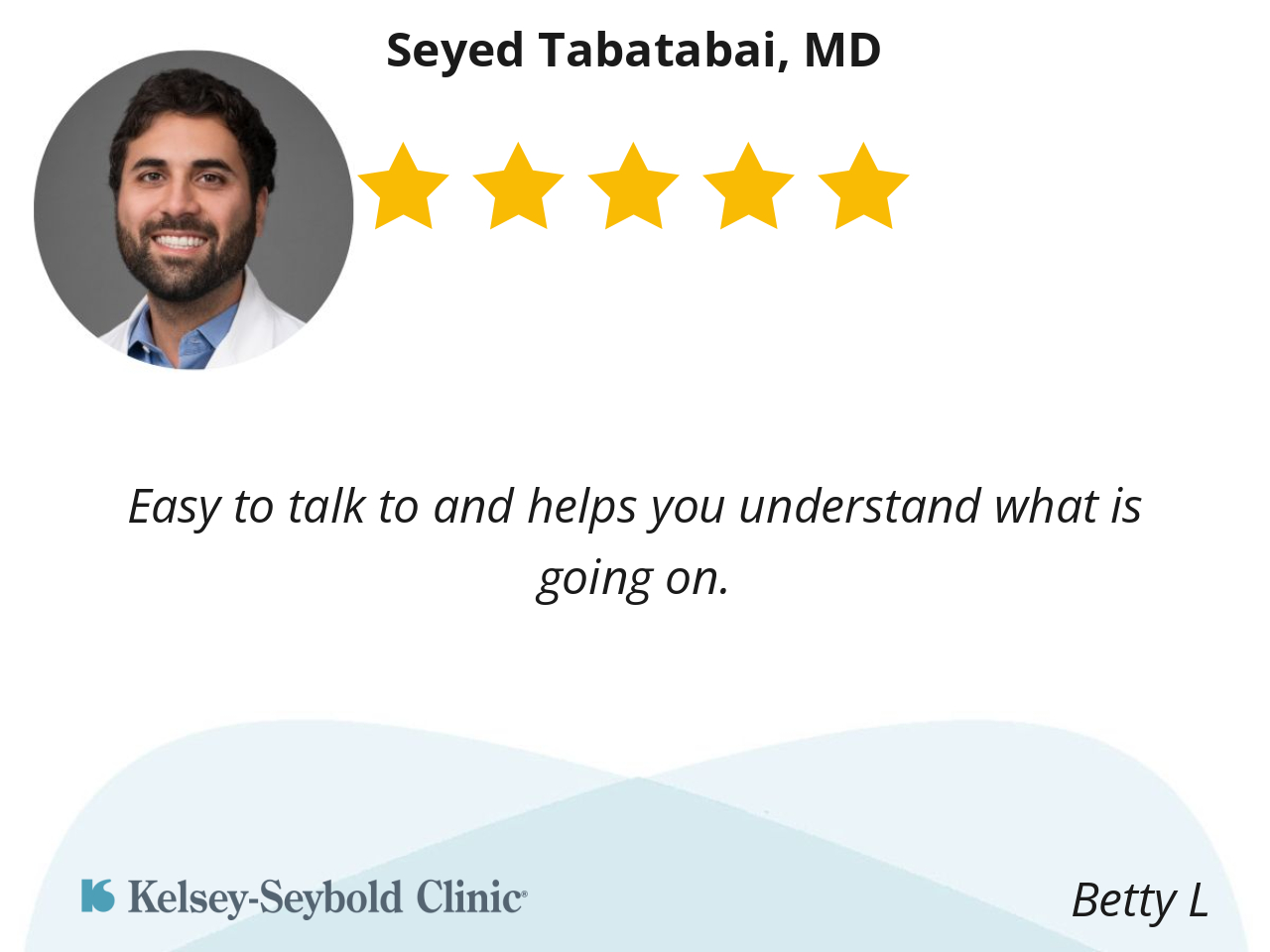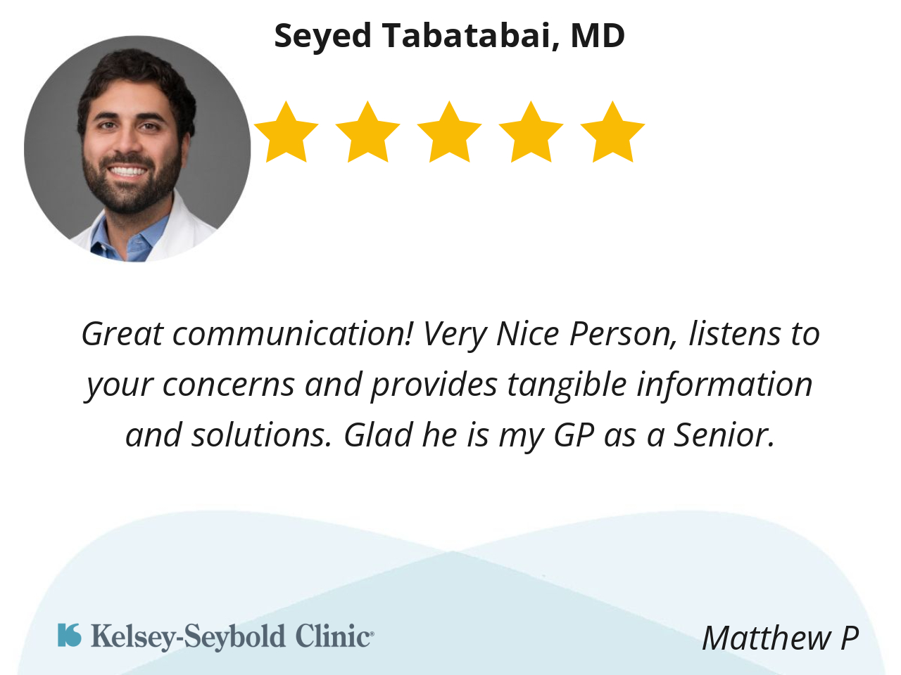 I had appointment with doctor Tabatabai for my yearly physical and it all went very well. Dr T is very professional and caring and that is what makes him a great doc!