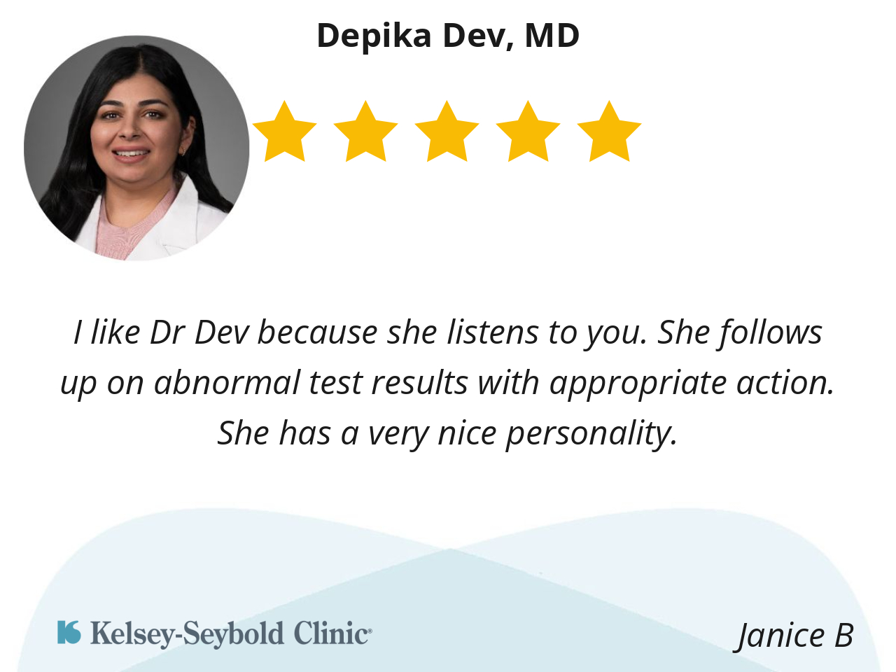 I like Dr Dev because she listens to you. She follows up on abnormal test results with appropriate action. She has a very nice personality.