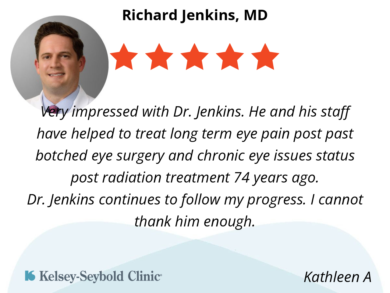 Very impressed with Dr. Jenkins. He and his staff have helped to treat long term eye pain post past botched eye surgery and chronic eye issues status post radiation treatment 74 years ago.