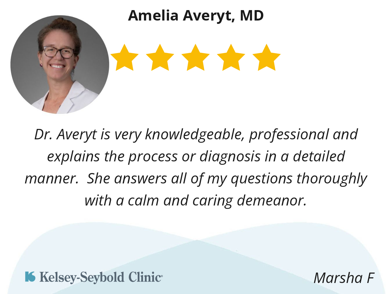 Dr. Averyt is very knowledgeable, professional and explains the process or diagnosis in a detailed manner. She answers all of my questions thoroughly with a calm and caring demeanor.