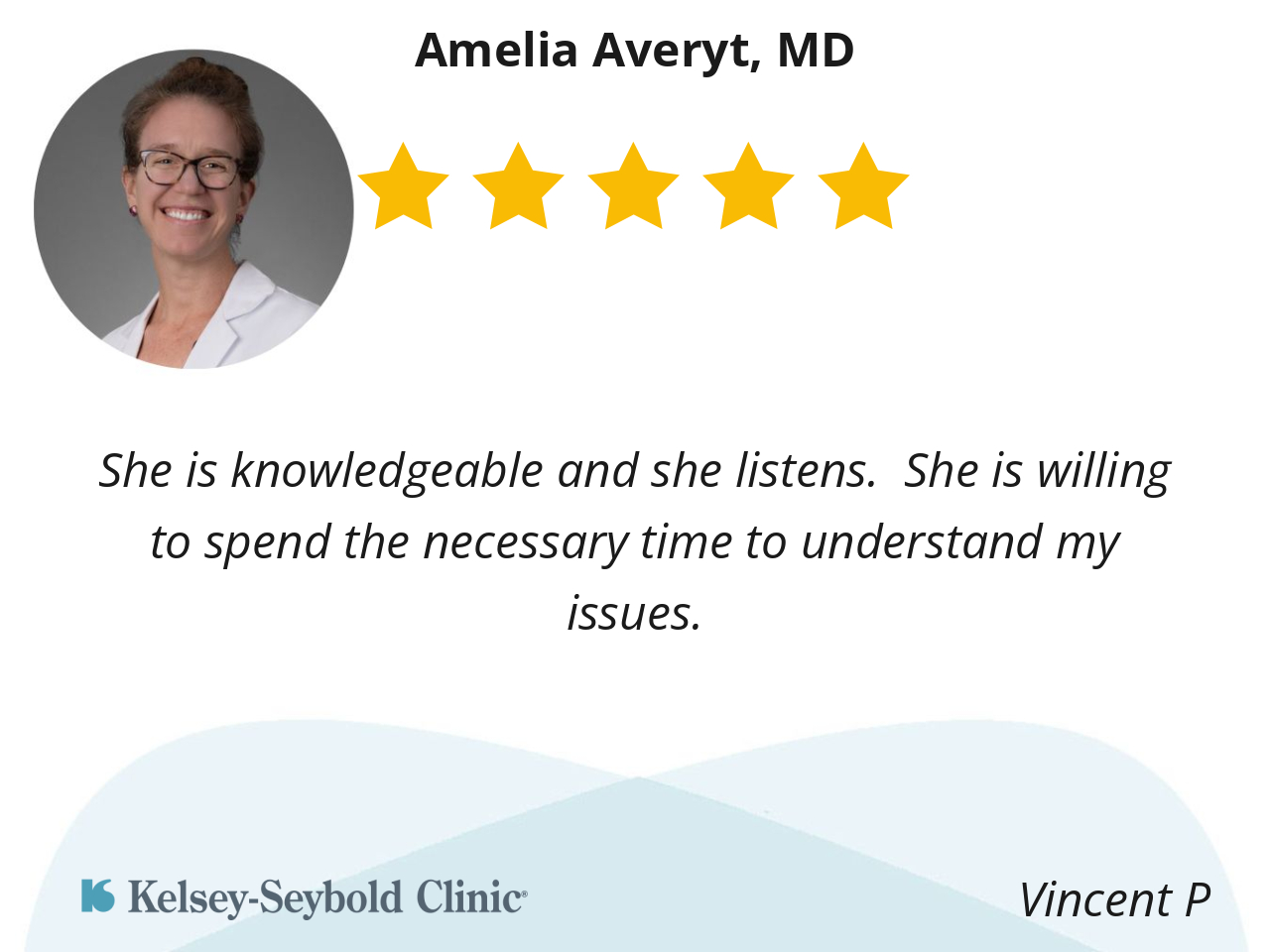 Dr. Averyt has continually demonstrated her willingness to listen. Not only does she listen, she involves the patient’s perspective and comes up with ways to accommodate patient’s wishes and medical effectiveness. Dr. Averyt mades you feel like you are not on a time clock, she ensures patients questions are answered, concerns are addressed and any doubts are assuaged. Just excellent care!