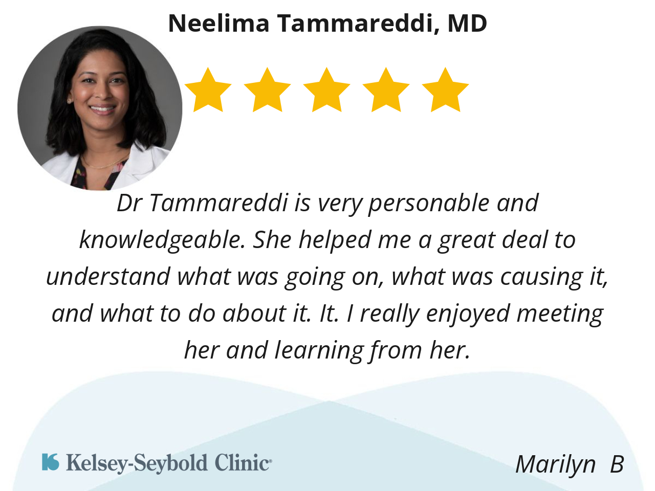 Dr Tammareddi is very personable and knowledgeable. She helped me a great deal to understand what was going on, what was causing it, and what to do about it. It. I really enjoyed meeting her and learning from her.