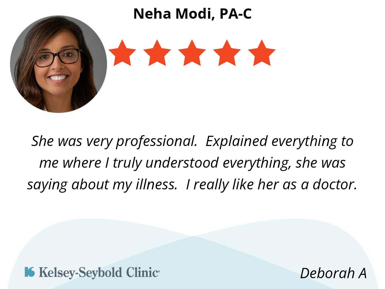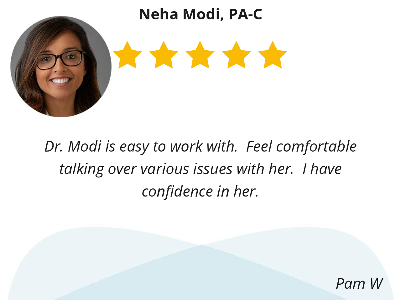 Neha Modi PA-C was very thorough and listened to my concerns. Her greet and smile was very calming.