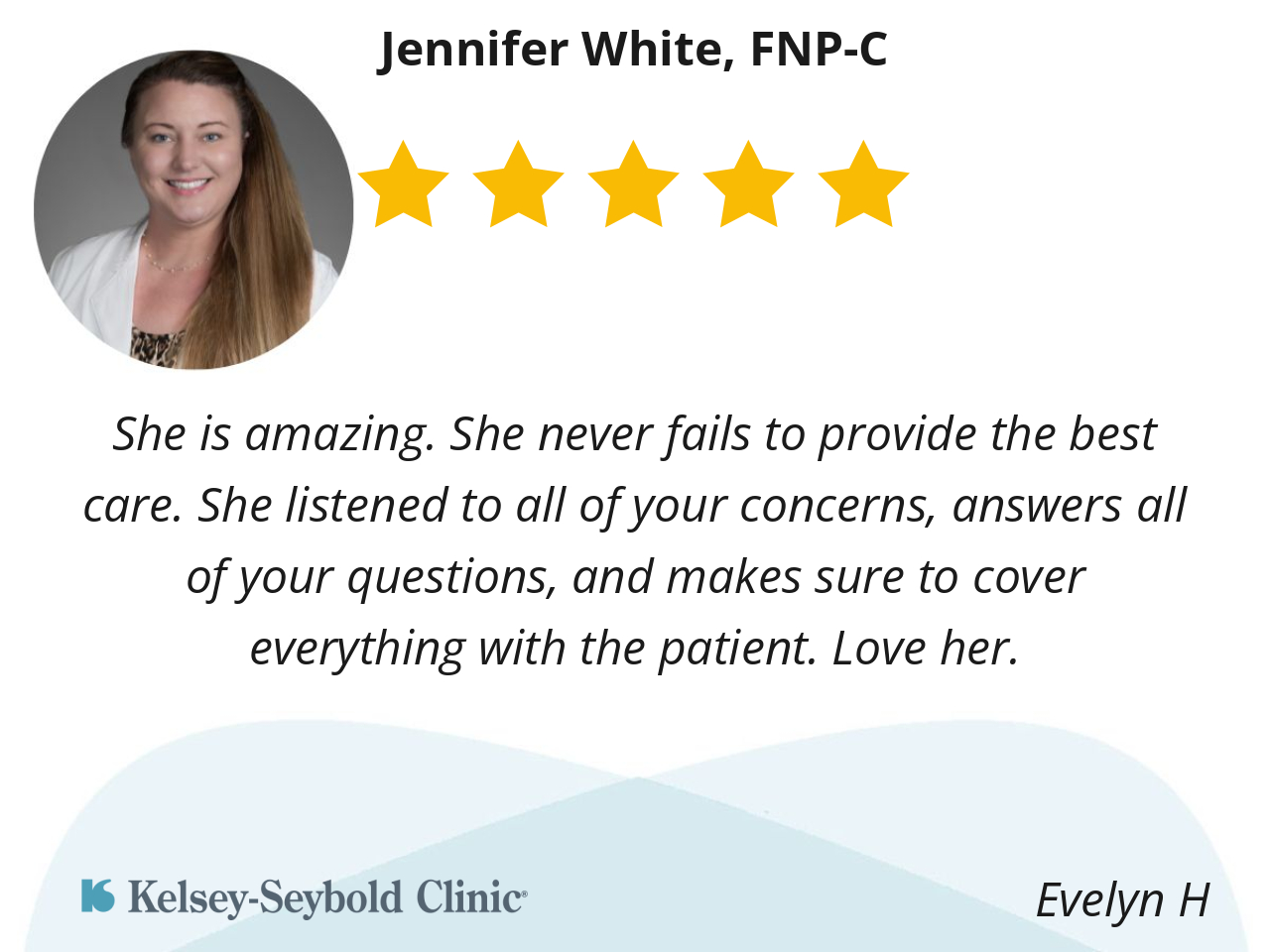 I have seen Jennifer four or five times and I cannot speak highly enough of her as a provider. She is warm and personable, yet very professional. She explains everything to you —including what insurance will and will not allow so you’re never blindsided by a large bill. She also takes her time and really helps you to feel heard. Would rate her higher if possible!