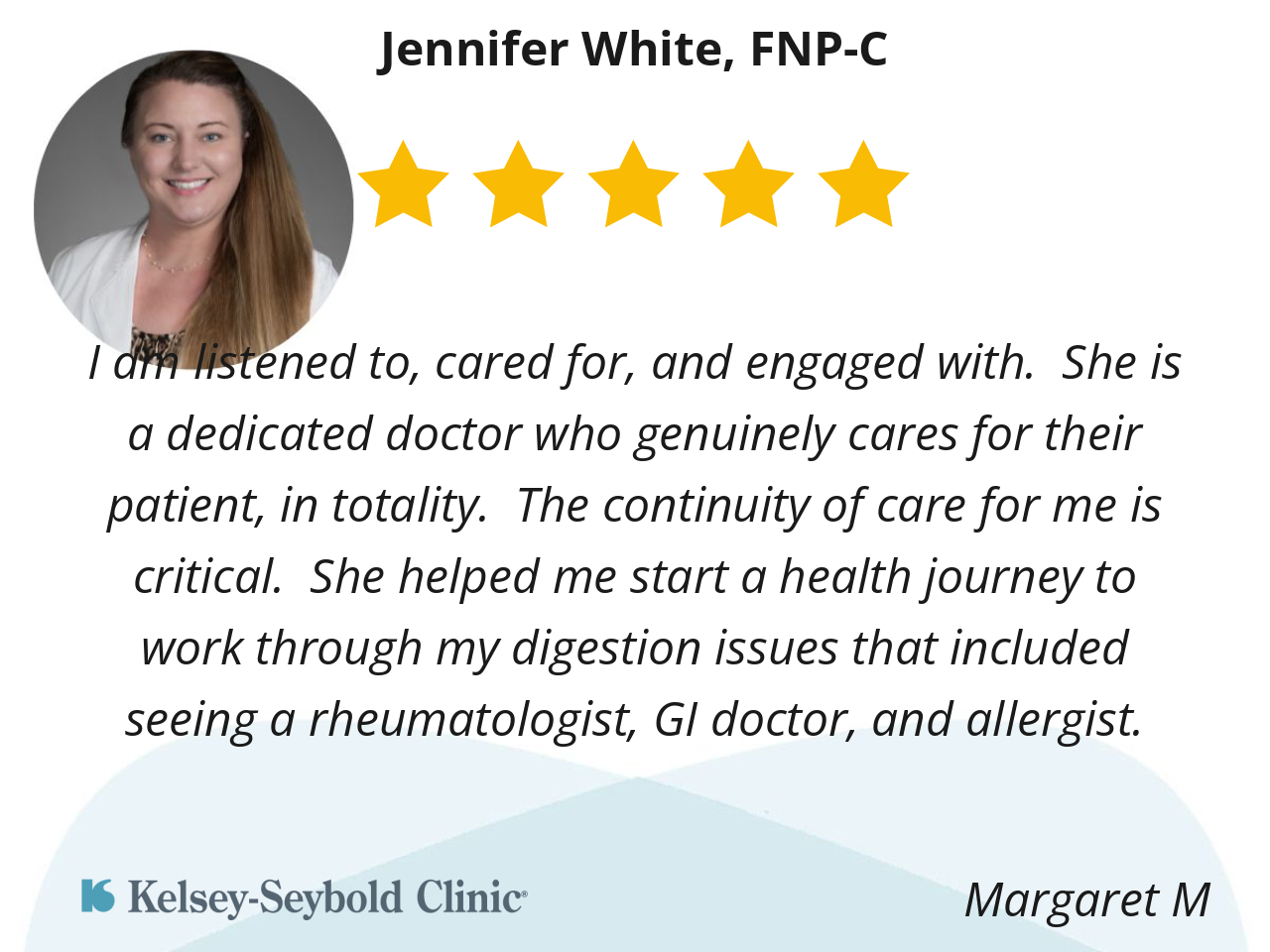 I am listened to, cared for, and engaged with. She is a dedicated doctor who genuinely cares for their patient, in totality. The continuity of care for me is critical. She helped me start a health journey to work through my digestion issues that included seeing a rheumatologist, GI doctor, and allergist.