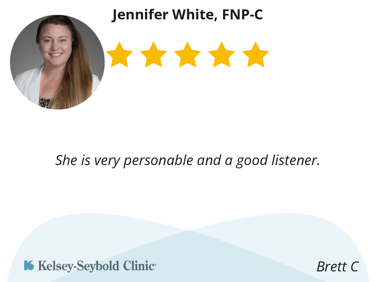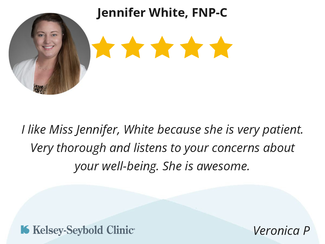 I like Miss Jennifer, White because she is very patient. Very thorough and listens to your concerns about your well-being. She is awesome.
