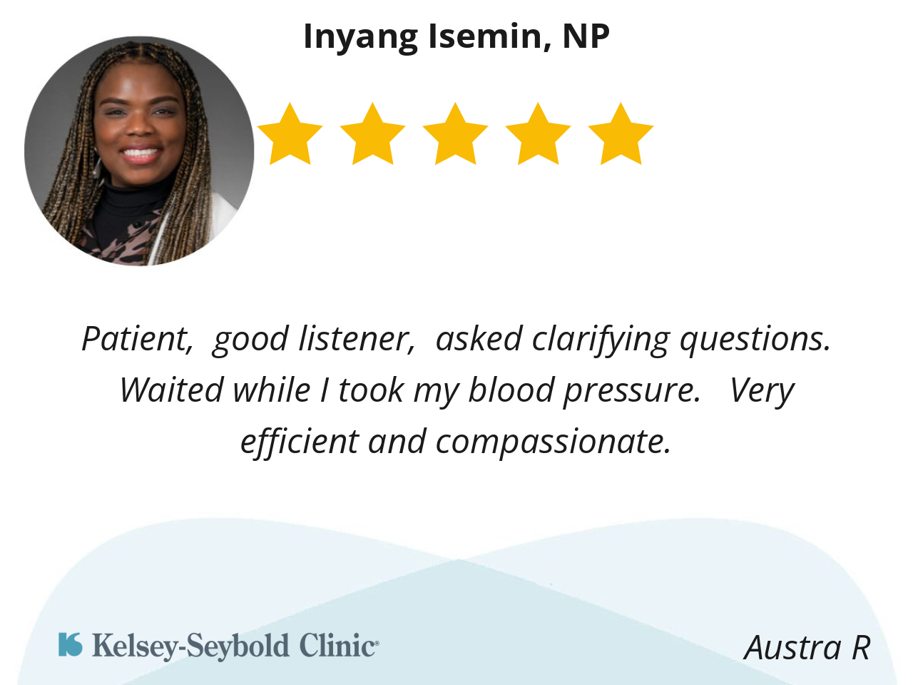 Patient, good listener, asked clarifying questions. Waited while I took my blood pressure. Very efficient and compassionate.