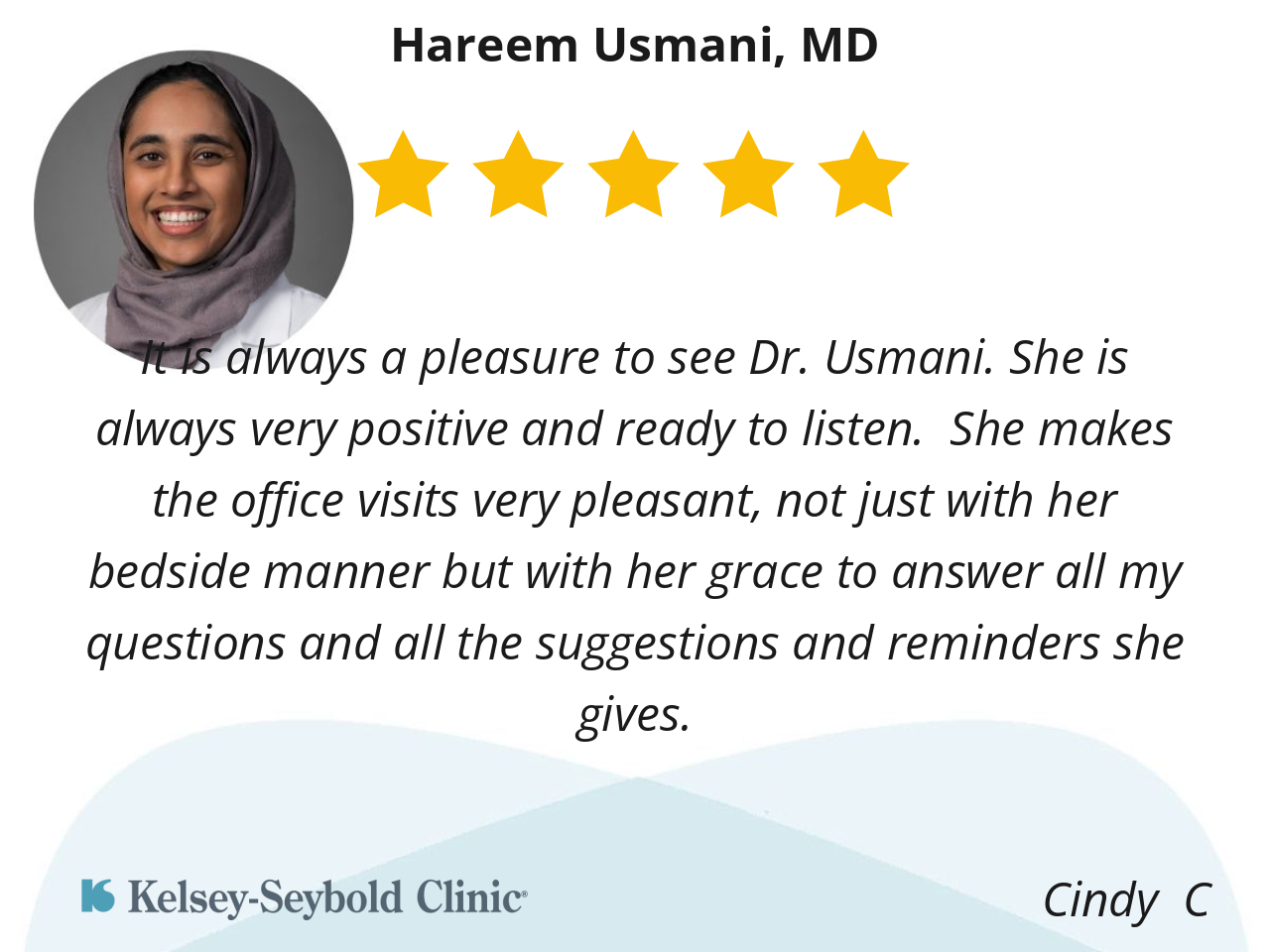 It is always a pleasure to see Dr. Usmani. She is always very positive and ready to listen. She makes the office visits very pleasant, not just with her bedside manner but with her grace to answer all my questions and all the suggestions and reminders she gives.
