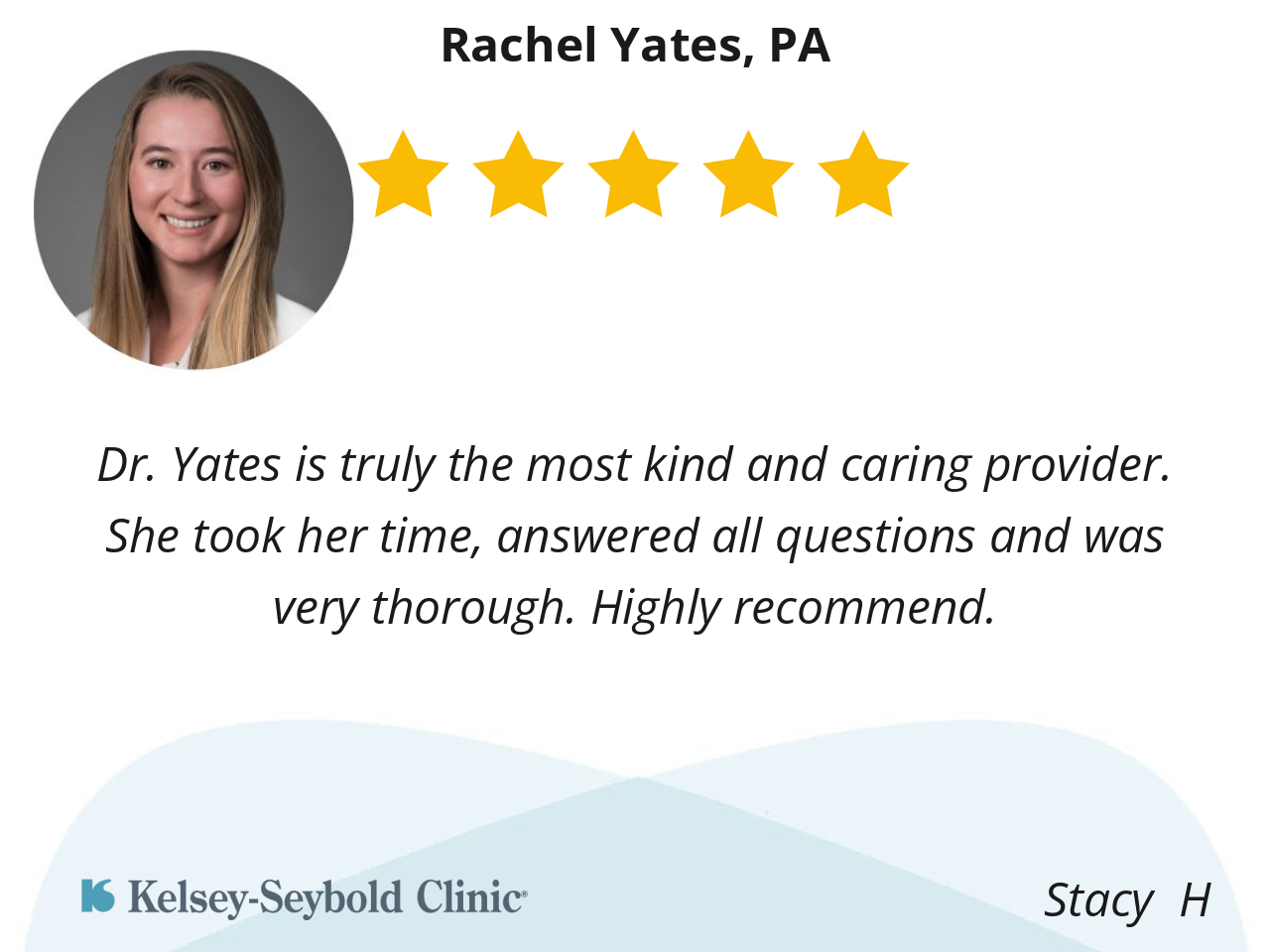 Dr. Yates is truly the most kind and caring provider. She took her time, answered all questions and was very thorough. Highly recommend.