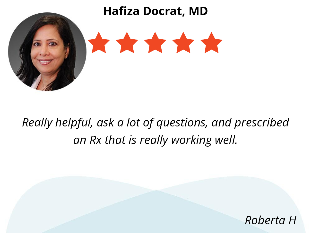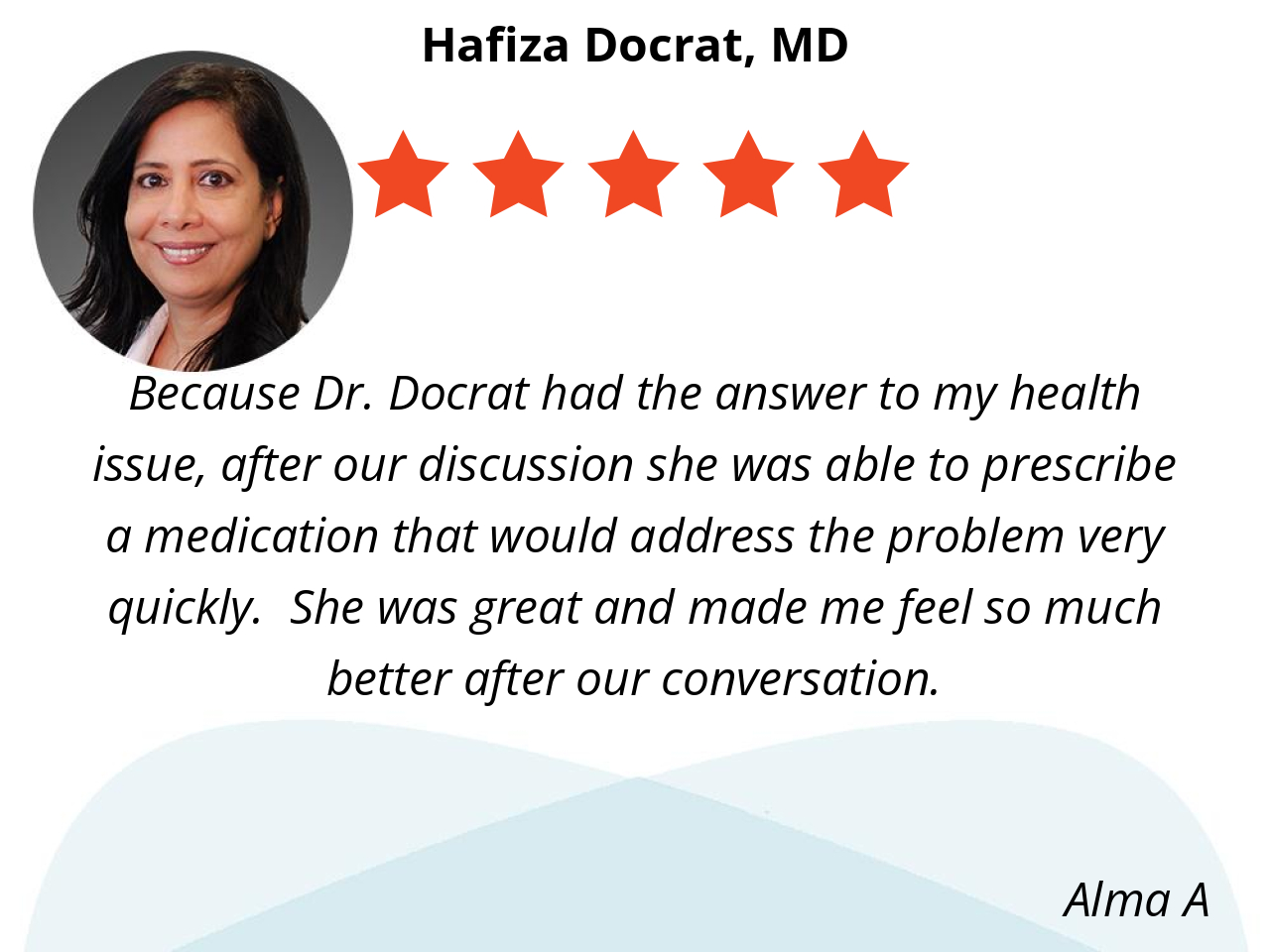 Because Dr. Docrat had the answer to my health issue, after our discussion she was able to prescribe a medication that would address the problem very quickly. She was great and made me feel so much better after our conversation.