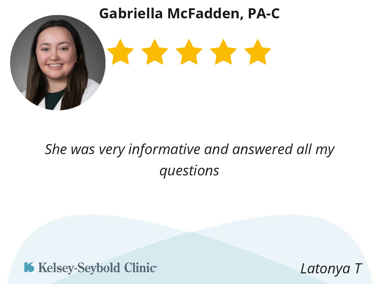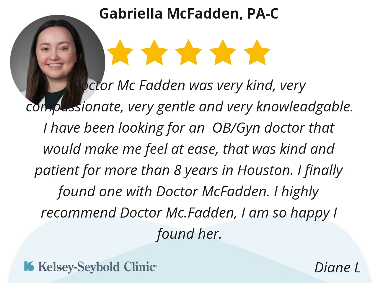 Doctor Mc Fadden was very kind, very compassionate, very gentle and very knowleadgable. I have been looking for an OB/Gyn doctor that would make me feel at ease, that was kind and patient for more than 8 years in Houston. I finally found one with Doctor McFadden. I highly recommend Doctor Mc.Fadden, I am so happy I found her.