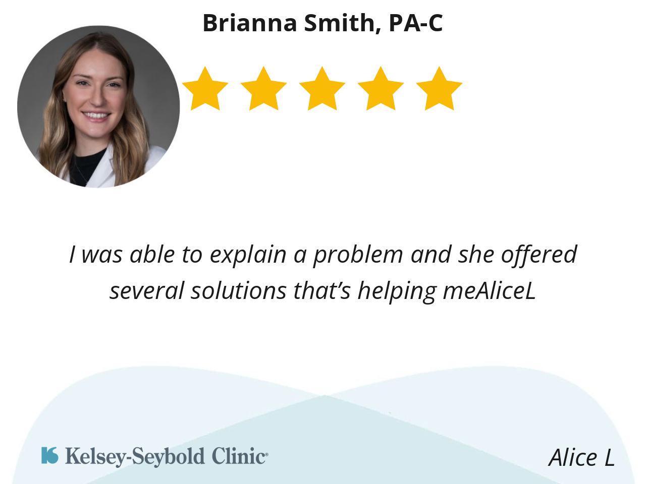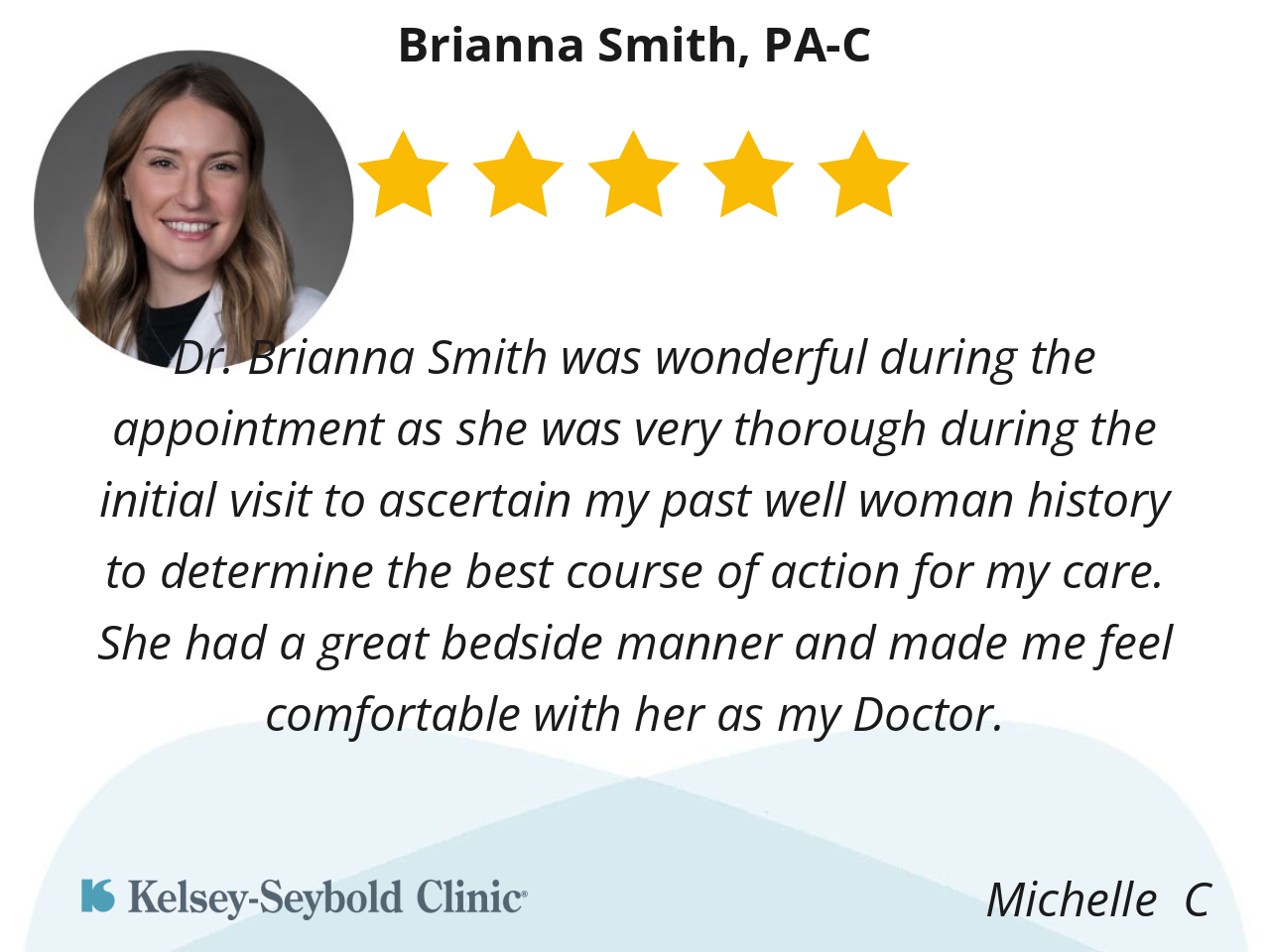 Dr. Brianna Smith was wonderful during the appointment as she was very thorough during the initial visit to ascertain my past well woman history to determine the best course of action for my care. She had a great bedside manner and made me feel comfortable with her as my Doctor.