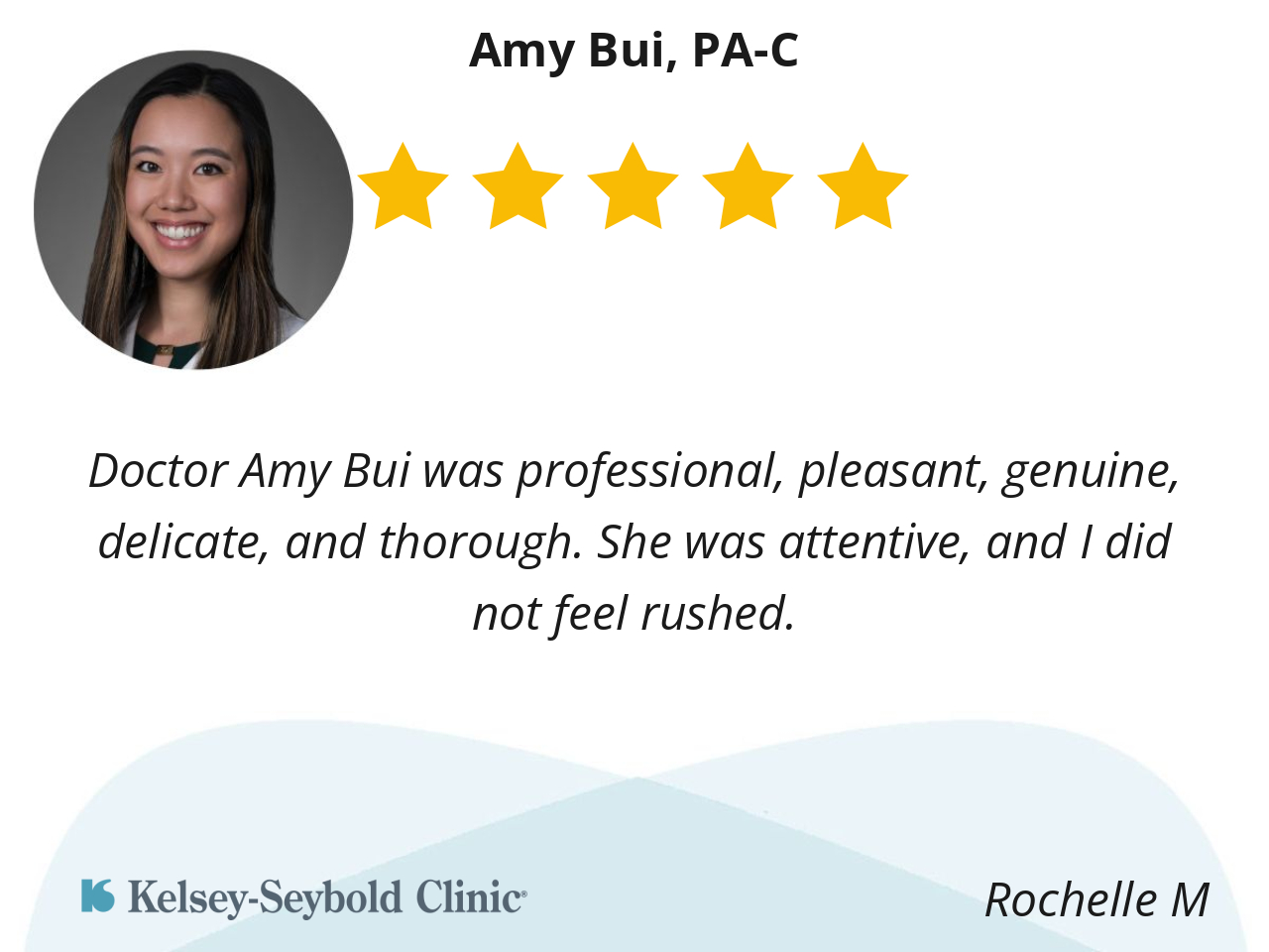 Doctor Amy Bui was professional, pleasant, genuine, delicate, and thorough. She was attentive, and I did not feel rushed.
