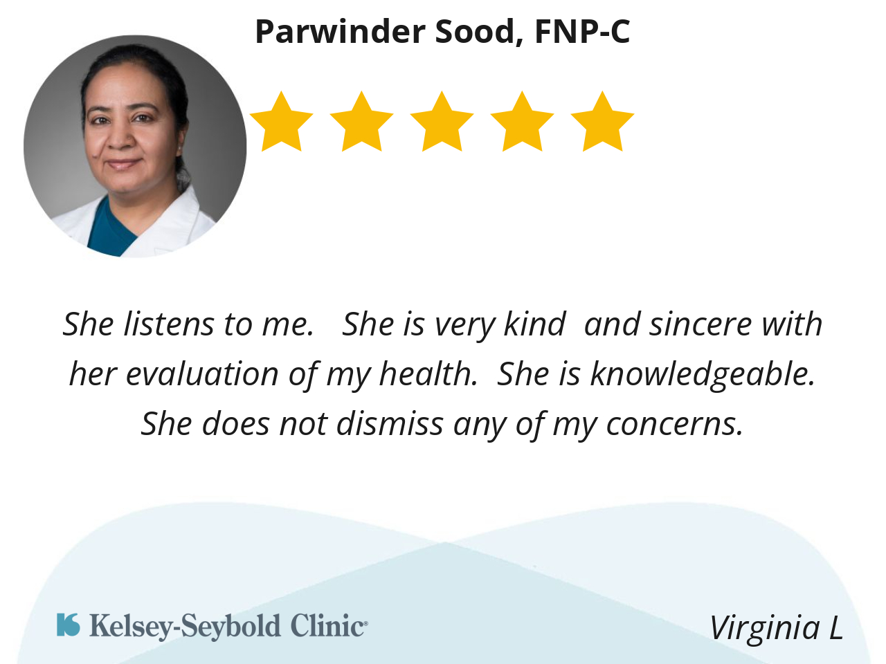 Thanks to Dr. Parwinder Sood, since I have had this problem since the beginning of the year and she was the only one who listened to me regarding the fact that I had kidney stones in the past. She sent me to a urology specialist who I will visit next Tuesday. Dr. Parwinder Sood, thank you for listening to me.