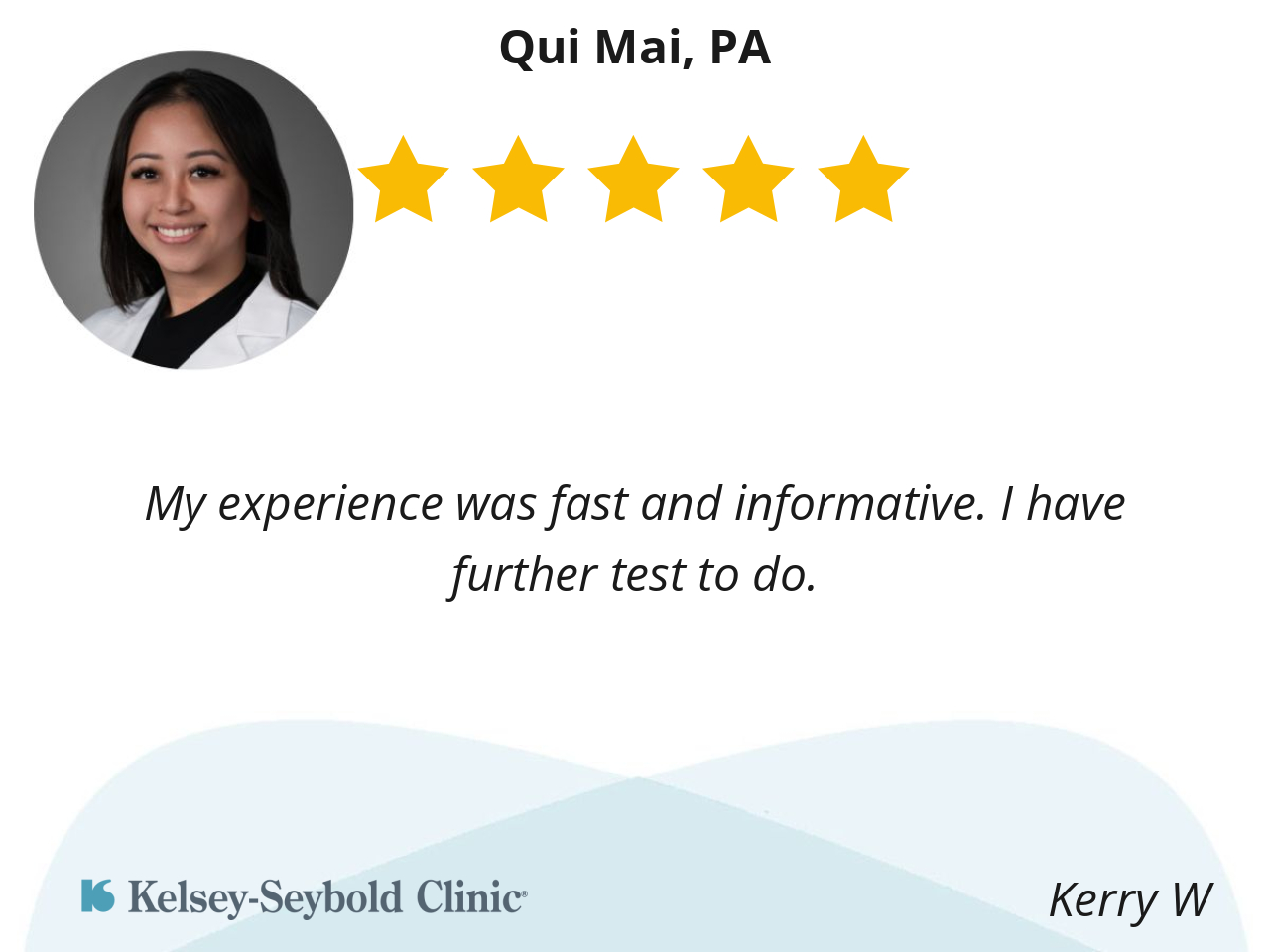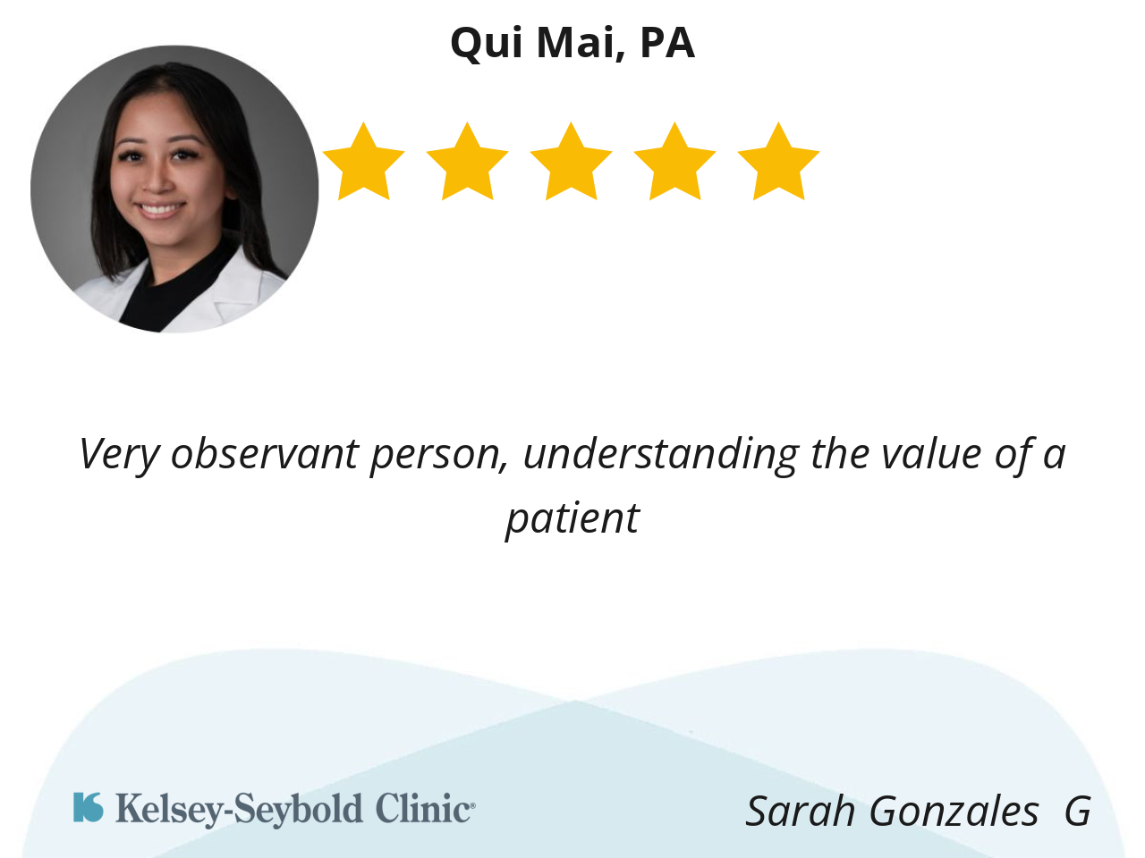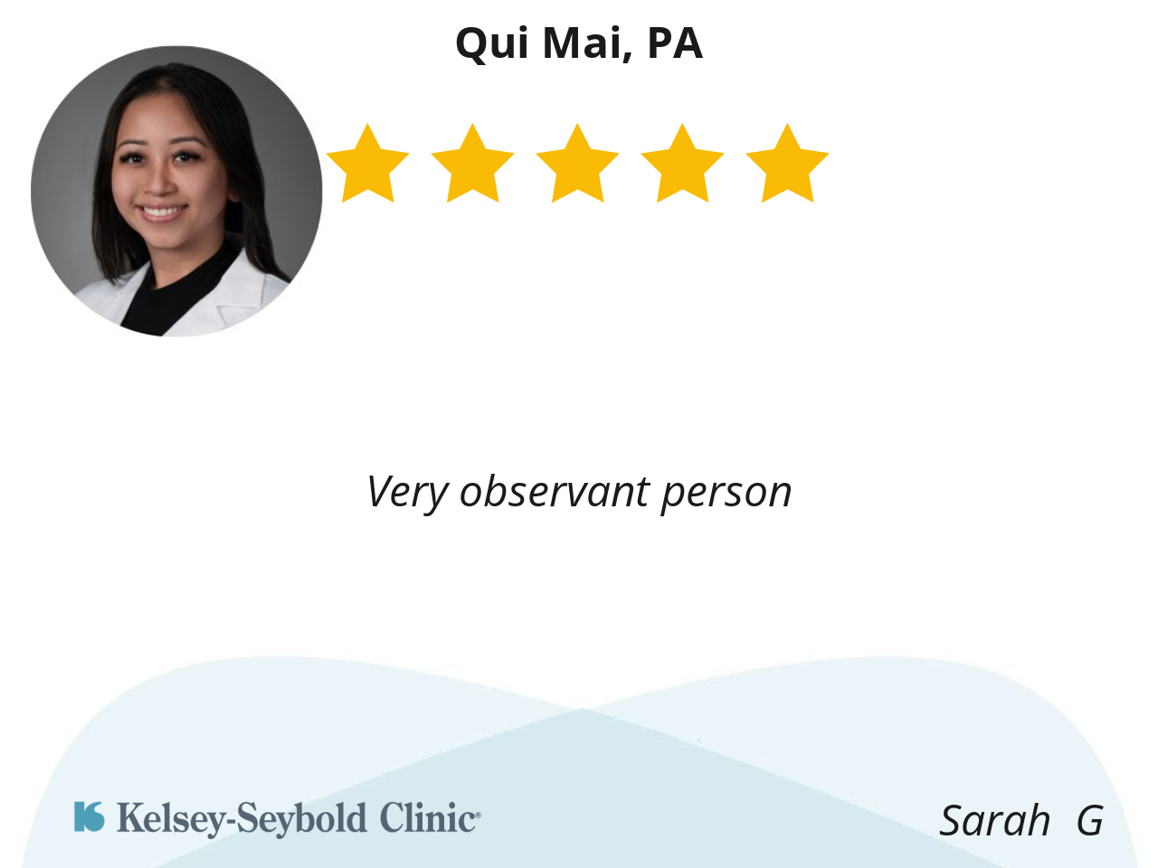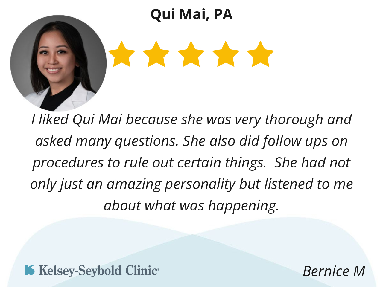 I liked Qui Mai because she was very thorough and asked many questions. She also did follow ups on procedures to rule out certain things. She had not only just an amazing personality but listened to me about what was happening.