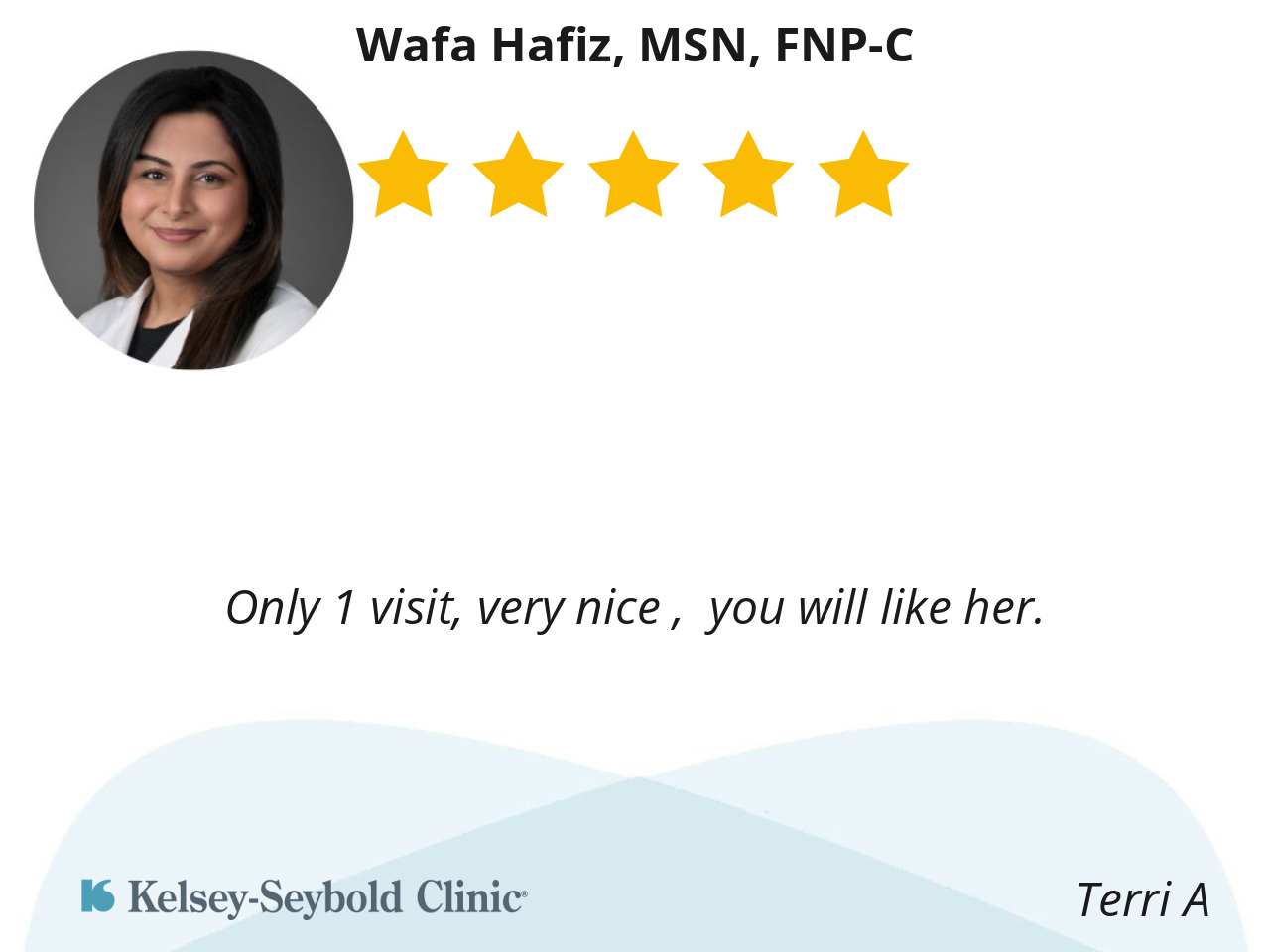 My first visit, had to see someone quickly . She was very professional , and very easy to talk to. She started setting up appointments and blood work, and medicine, She is still calling back , with the next steep to follow.